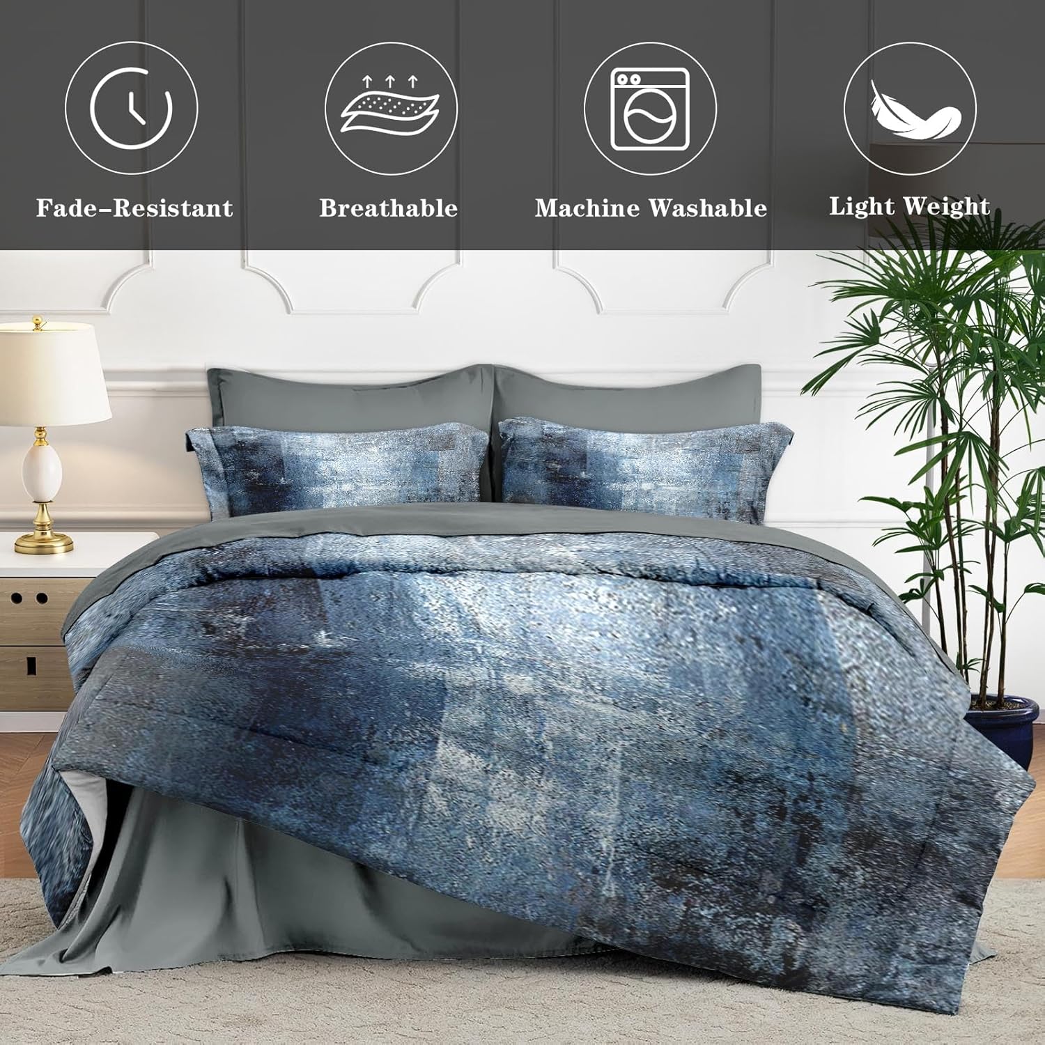 Whether you're decorating a childâs room, upgrading a guest bedroom, or preparing for a trip, this comforter set is the perfect solution. Its lightweight and portable design makes it easy to take along for vacations or use in dorms, RVs, and other temporary living spaces. The contemporary blue grey and white color scheme adds a touch of elegance and modern simplicity to any room, blending seamlessly with various styles of decor.