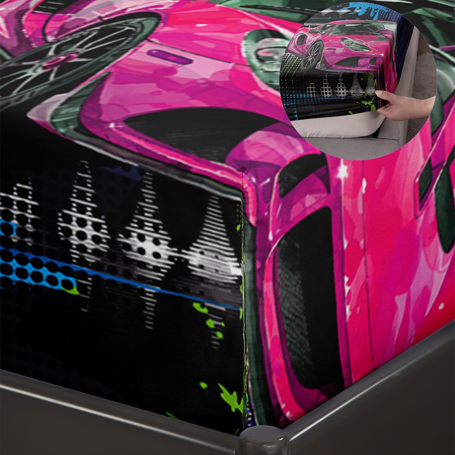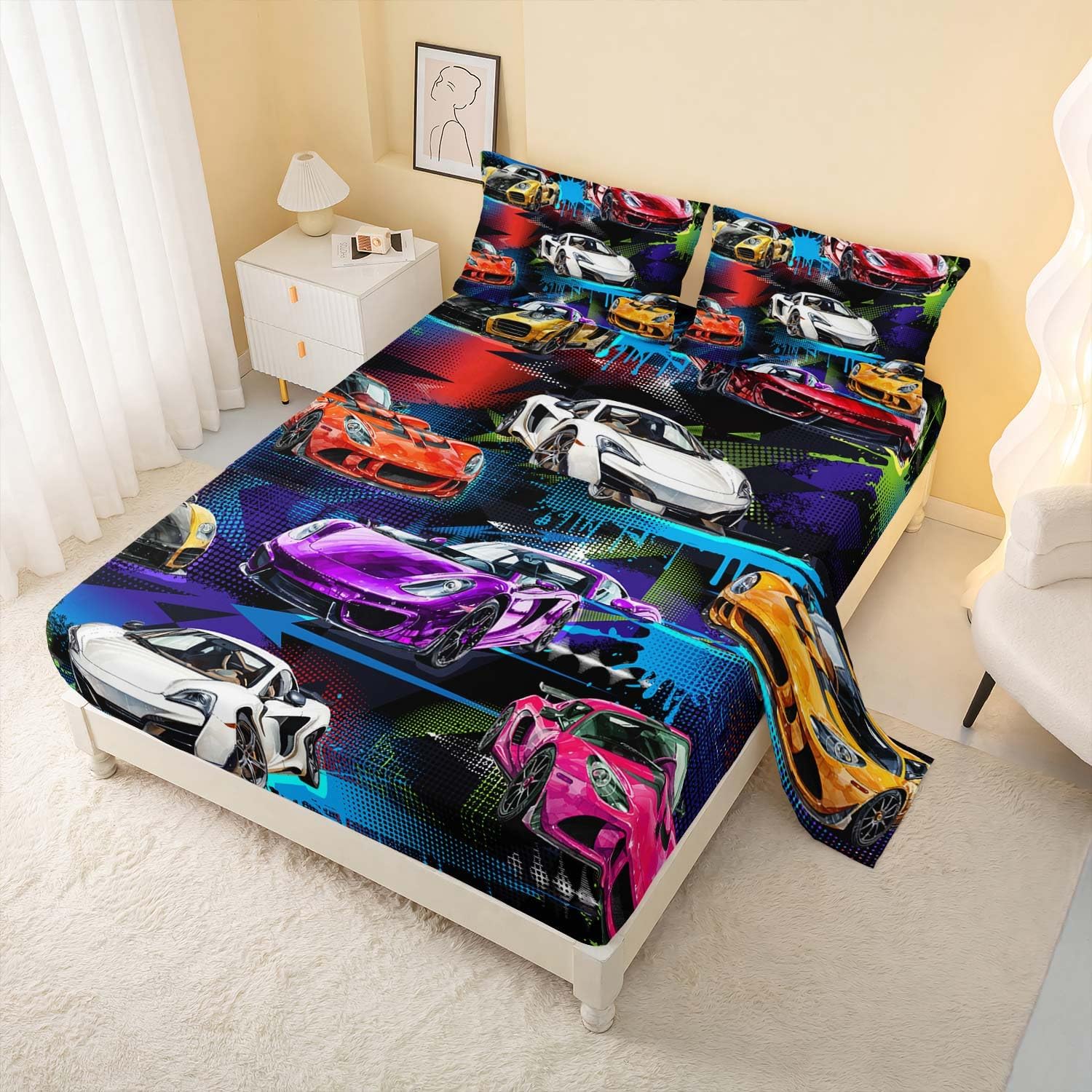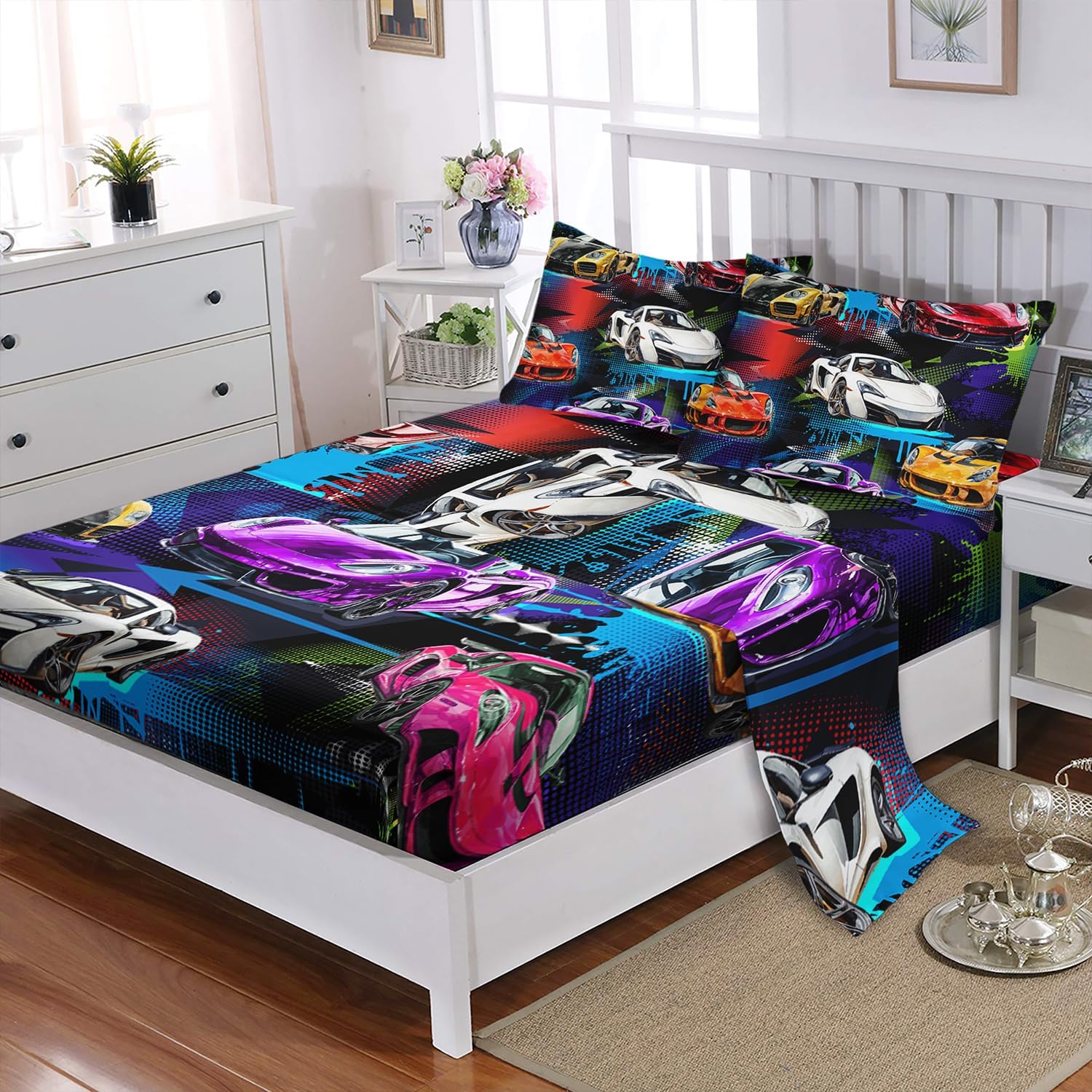 AILONEN Racing Car Fitted Sheet Set for Kids Twin Size brings comfort and style to any bedroom. Made from 100% microfiber fabric, it features a vibrant racing car design, includes 1 fitted sheet, 1 flat sheet, and 2 pillowcases, and is easy to care for. Perfect for a child's room or as a colorful gift.