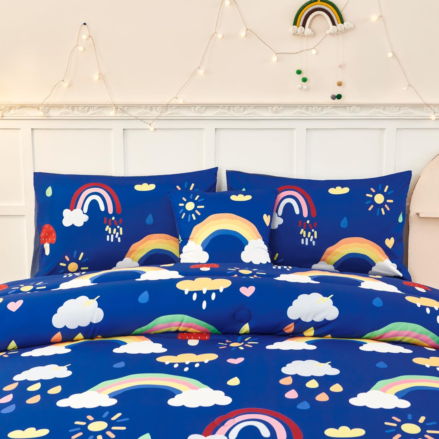 Make your child's room a cozy haven with the ANGIYUIN Blue Rainbow Kids Full Bed in a Bag Comforter Set. With its playful charm and comfort, it's a great gift for new babies, a way to refresh nursery decor, or a daily essential for your little one.