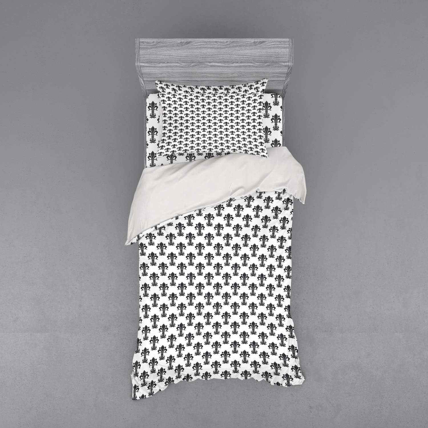 Bring a timeless European charm to your child's bedroom with this elegant Ambesonne Fleur De Lis bedding set. This set features a stunning design that beautifully blends the iconic Fleur De Lis symbol with intricate iris blossoms and flowing leaves, all in striking black and white. It adds a sophisticated and artistic touch to any space.