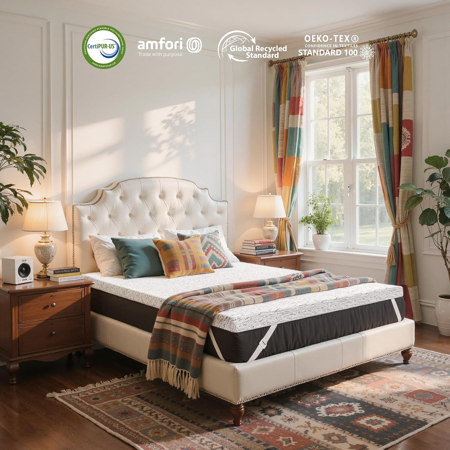 This topper is wrapped in a high-quality, breathable cover that prevents heat buildup and allows for better air flow. It’s designed to stay secure with anti-slip straps and a mesh bottom, ensuring it doesn't shift and adapts perfectly to any queen-sized mattress or bed frame. Plus, it’s CertiPUR-US and OEKO-TEX certified for safe, chemical-free sleep and long-term durability.