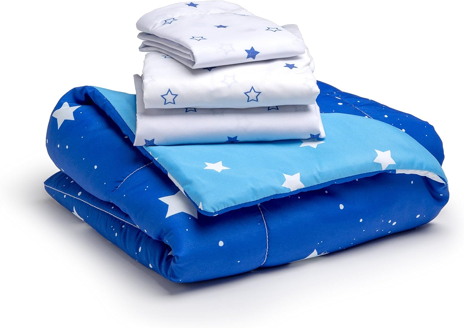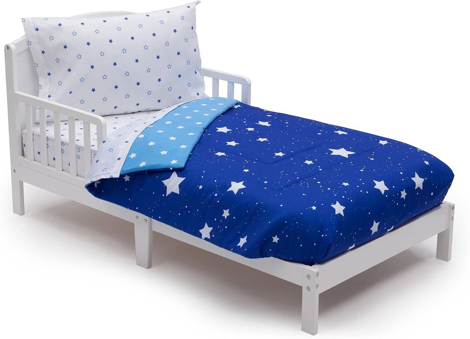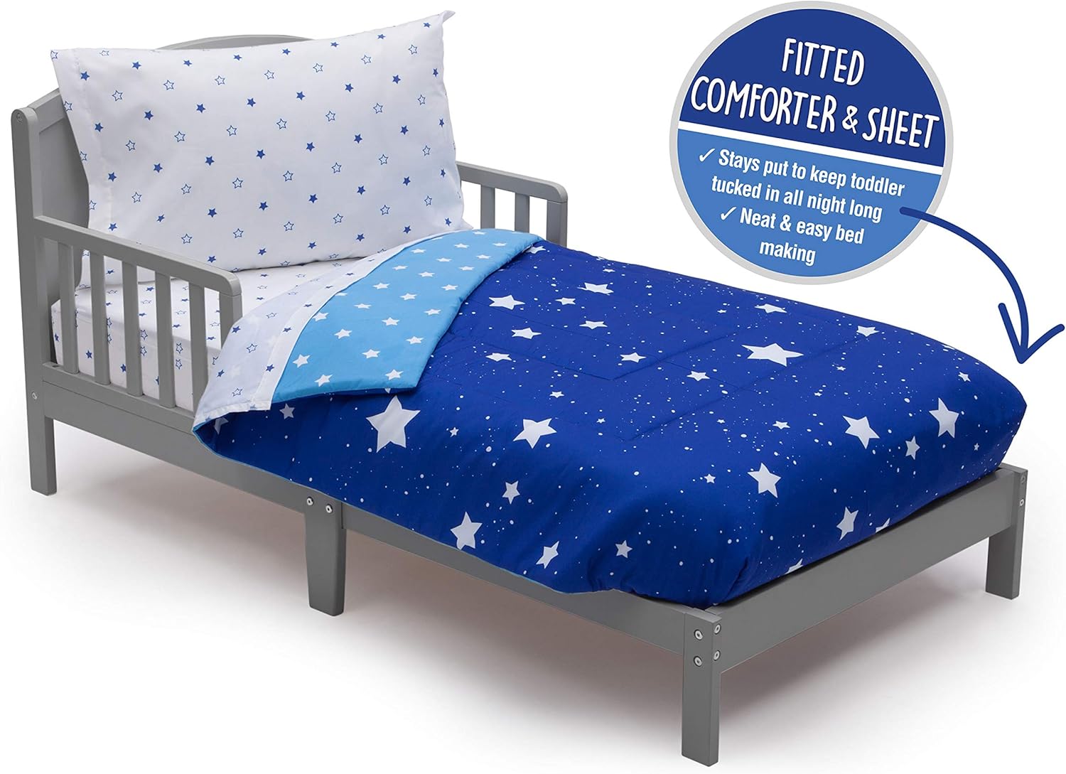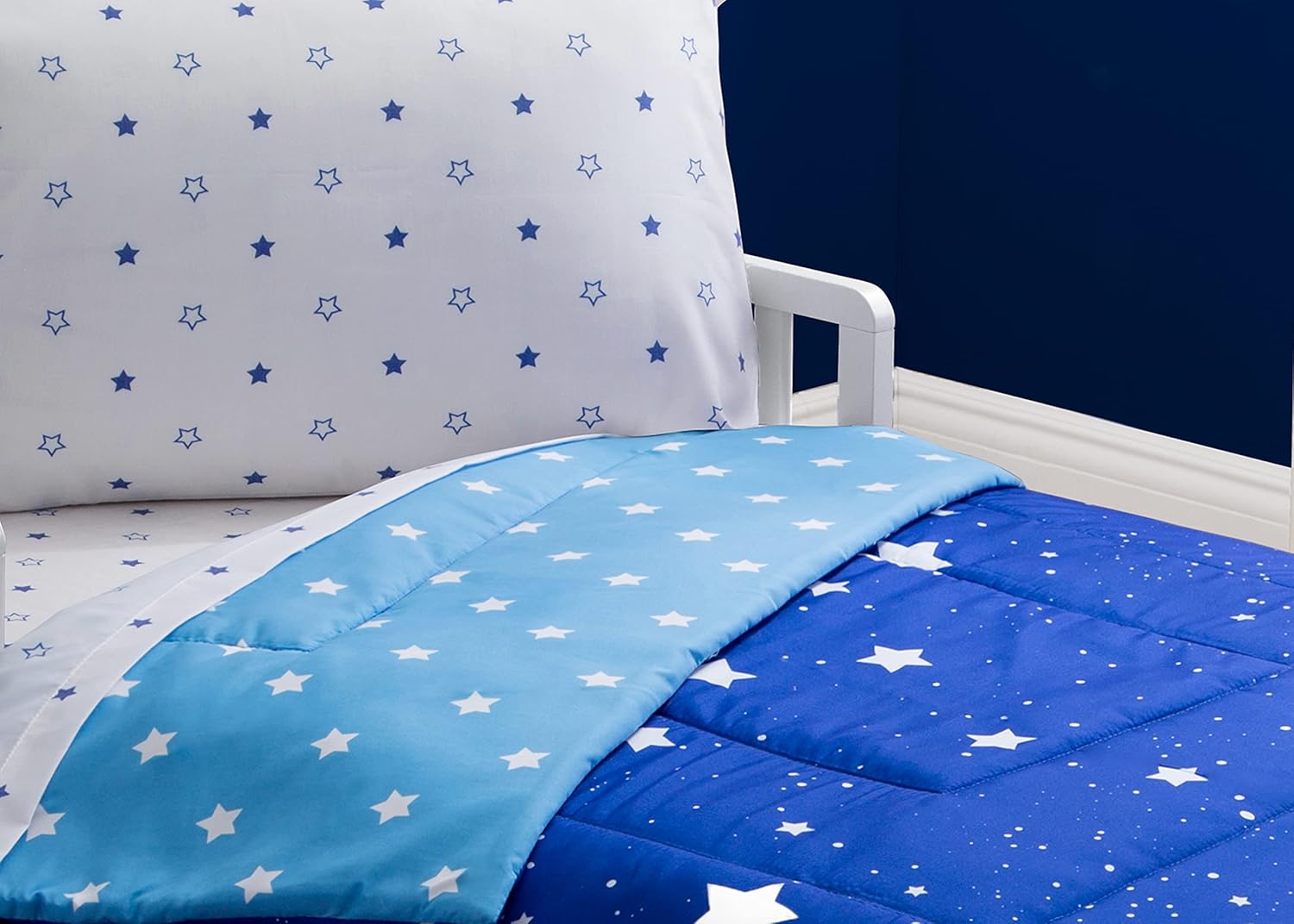 Create a comfortable, safe, and stylish sleep space for your little one with this 4-piece Delta Children toddler bedding set. Designed for both cribs and toddler beds, it fits a standard US mattress size of 27" x 52", offering a perfect fit for your childâs room. The set includes a fitted comforter, flat top sheet, bottom sheet, and a matching pillowcase, making it a complete and convenient solution for bedtime comfort. The reversible comforter boasts a charming blue stars design, allowing you to switch up the look while keeping the same high-quality feel. Whether you want to keep your child cozy in the winter or refresh the nursery decor with a new style, this 2-in-1 comforter makes it easy. Its elastic bottom and corners ensure that the bedding stays in place, providing a secure and snug sleep environment. Made from 100% polyester with a soft, breathable fill, this bedding set is both durable and gentle on sensitive skin. Itâs also machine-washable, so cleaning is a breeze. Plus, the care instructions recommend using non-chlorine bleach and low-heat drying, which helps maintain the beddingâs color and comfort for years to come. This Delta Children toddler bedding set is a great choice for parents who want stylish, easy-to-maintain, and safe bedding for their growing child.