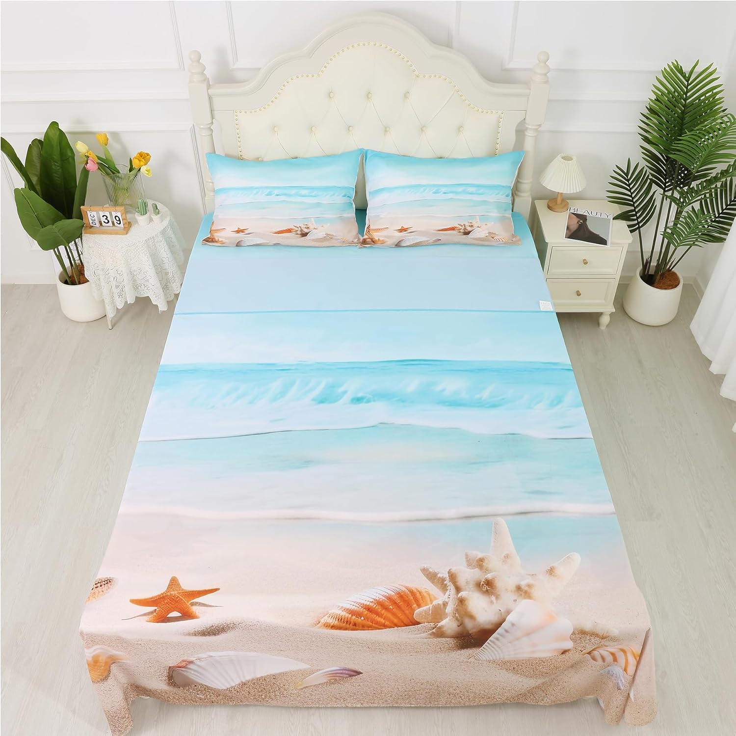 The 4-piece set includes a fitted sheet (60" x 80" x 14"), a flat sheet (102" x 90"), and two pillowcases (20" x 30"). With its deep pocket design, it fits up to 14-inch mattresses, ensuring a snug and secure feel. The bright, nature-inspired colors and whimsical starfish motifs make it the perfect easy care bedding for any kids' room decor.