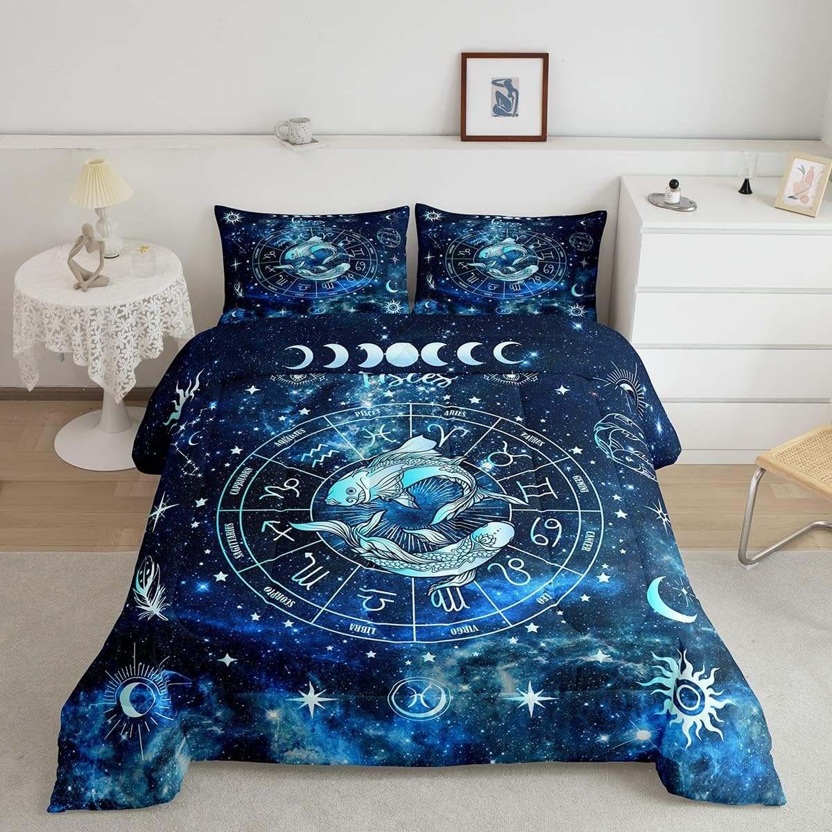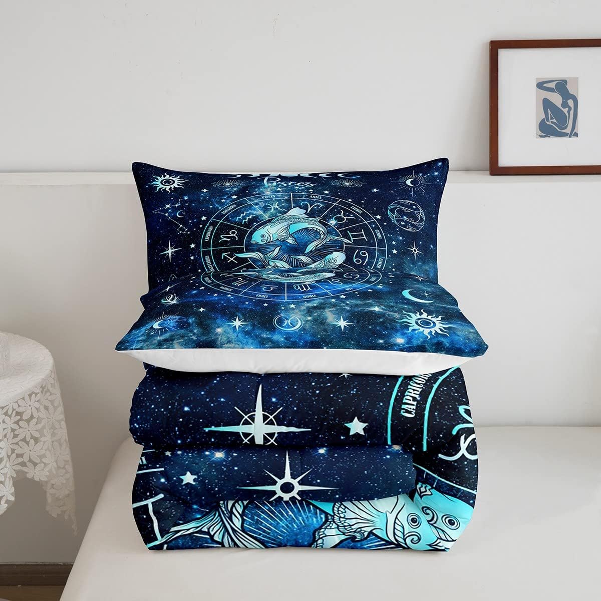 This Homewish Pisces Comforter Set brings a touch of celestial magic to your sleeping space. With its enchanting 3D digital print design, it features the 12 constellations and a soothing romantic blue theme, making it the perfect blend of style and comfort.