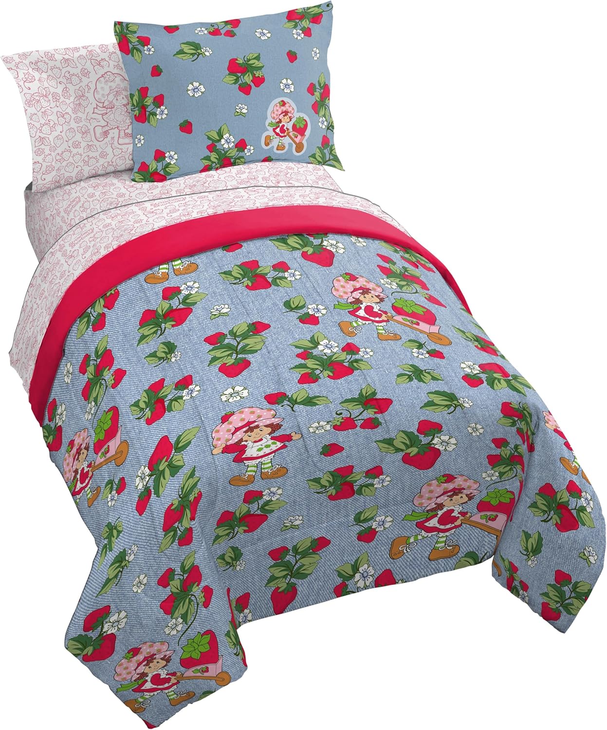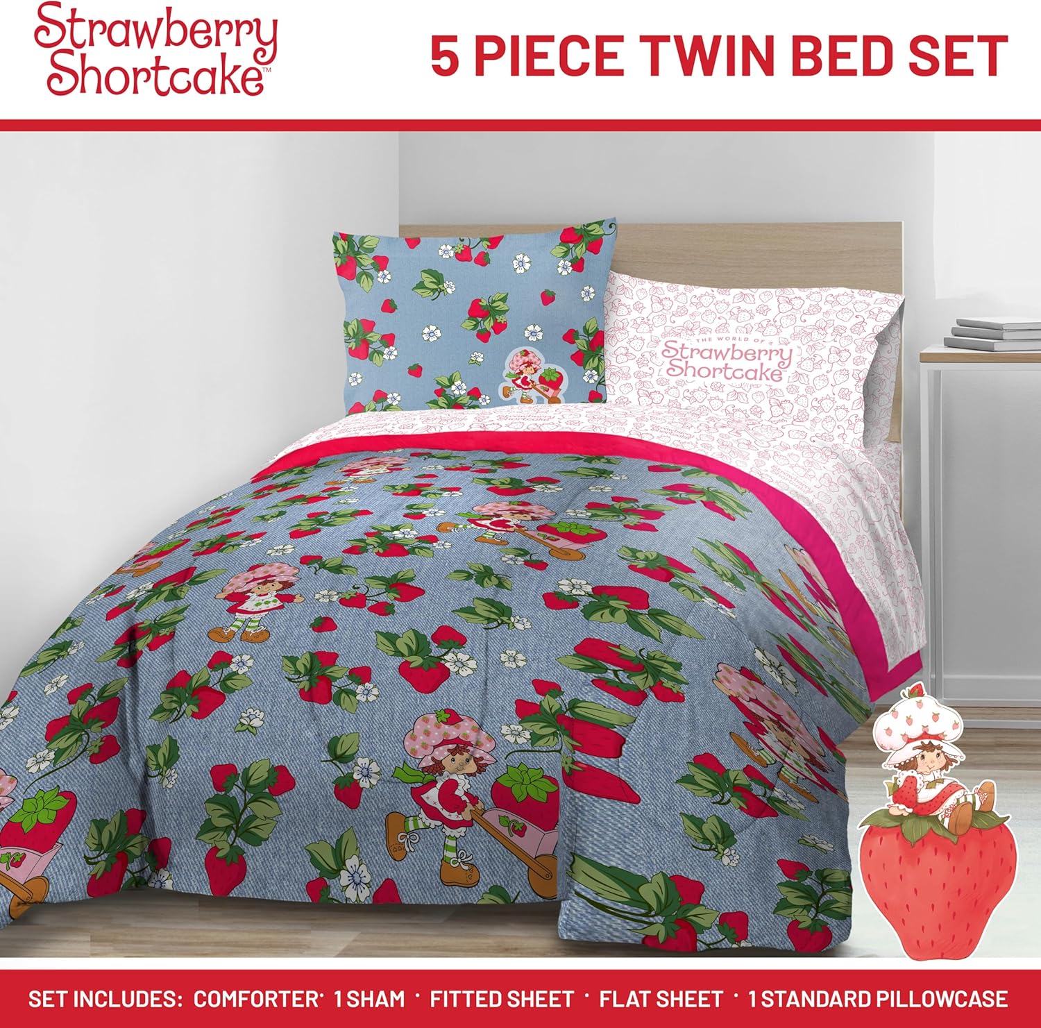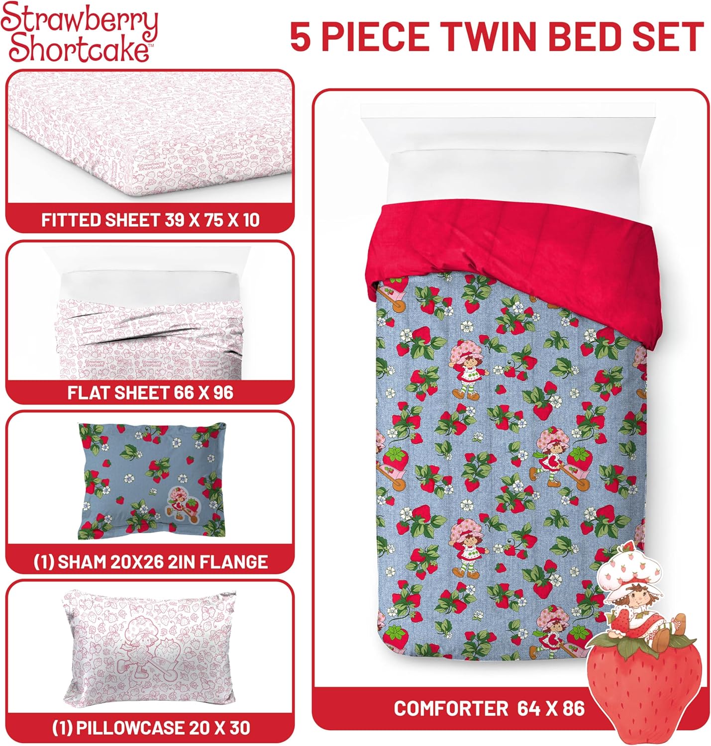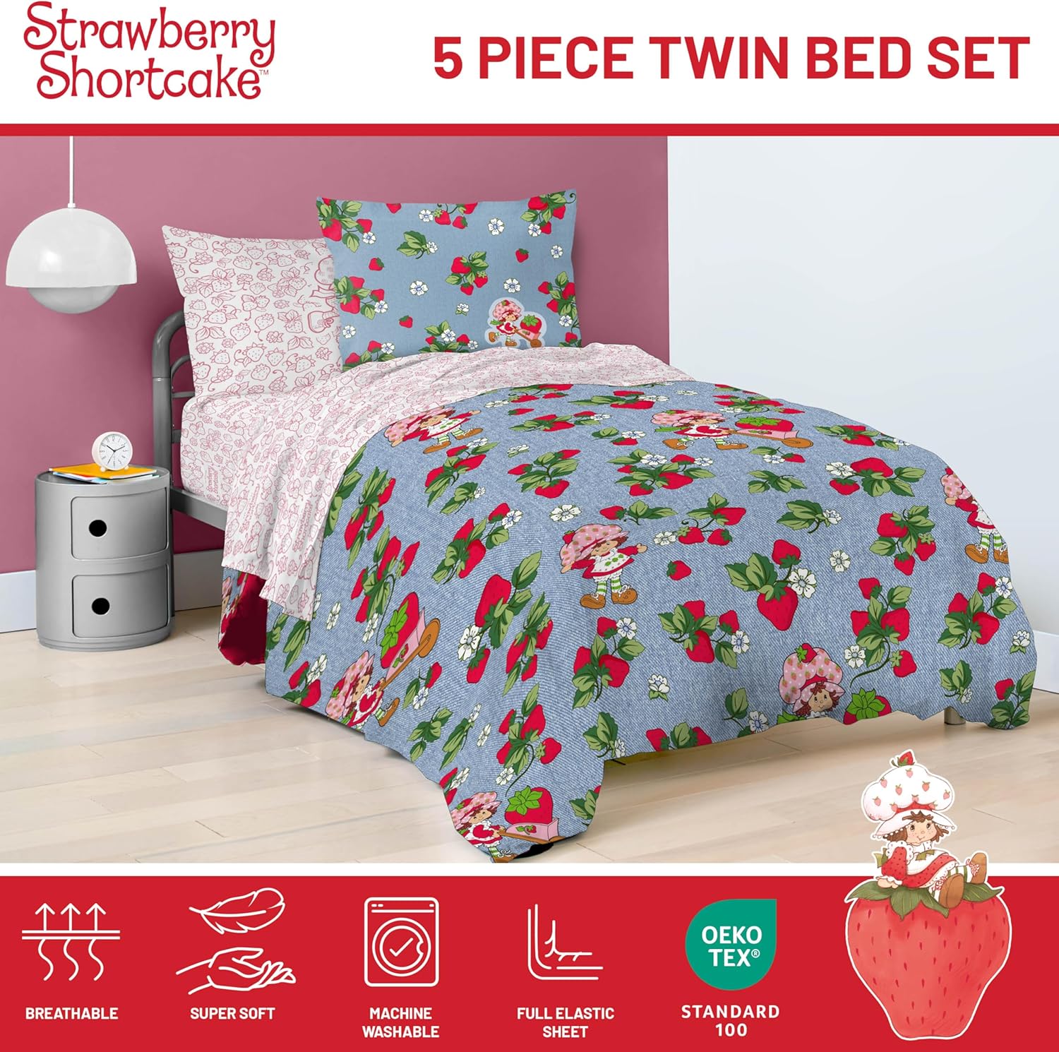 A trendy 5-piece twin comforter set featuring Strawberry Shortcake characters in soft blue. Perfect for adding charm and comfort to a child's bedroom or playroom with easy care and durable materials.