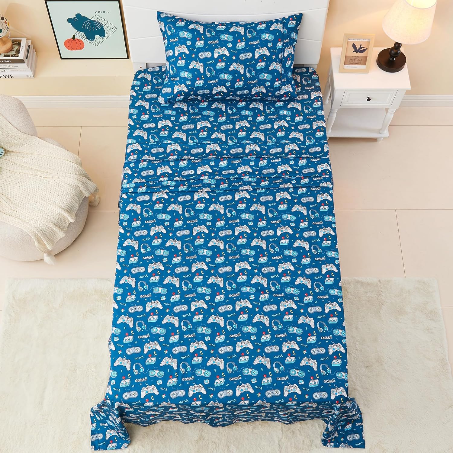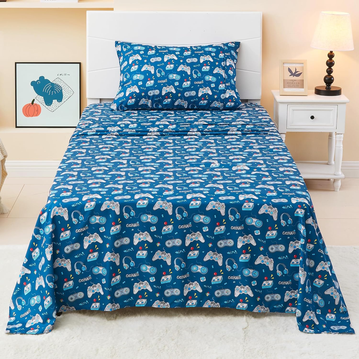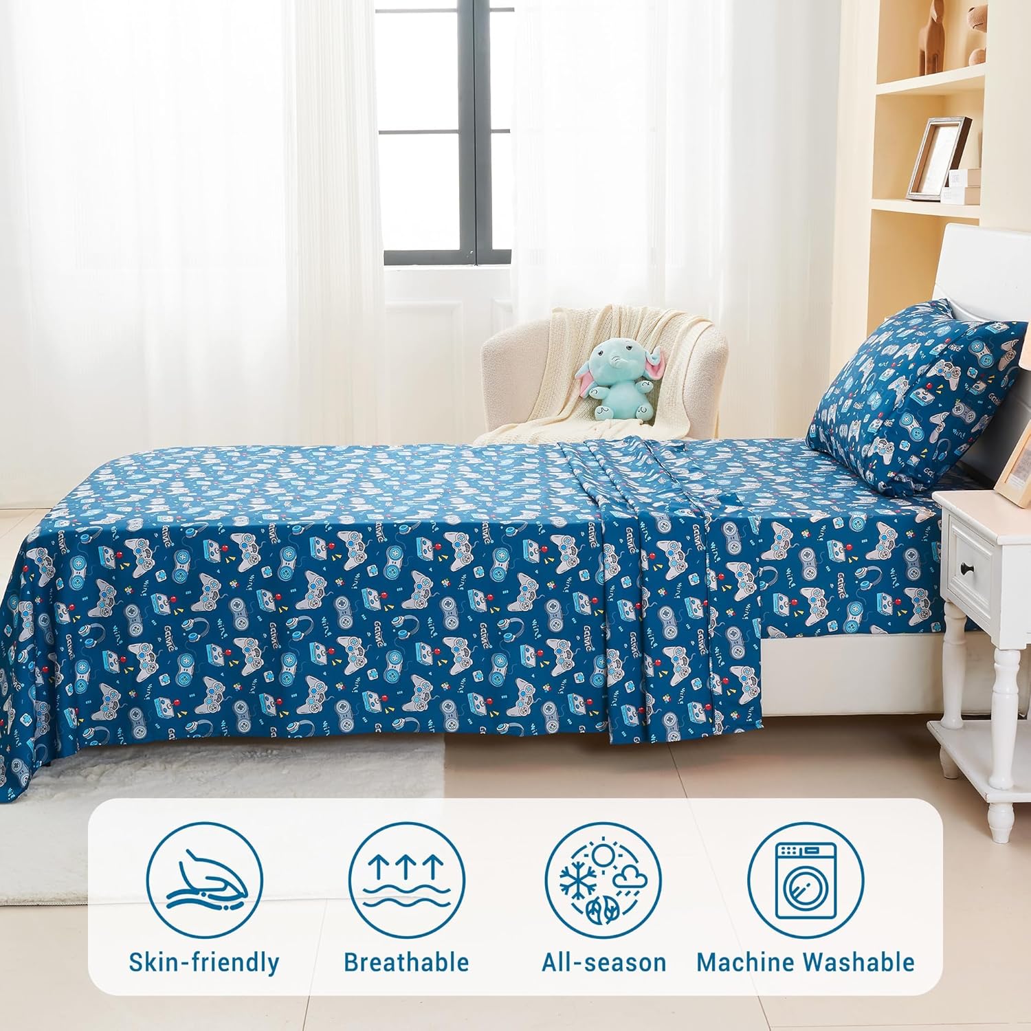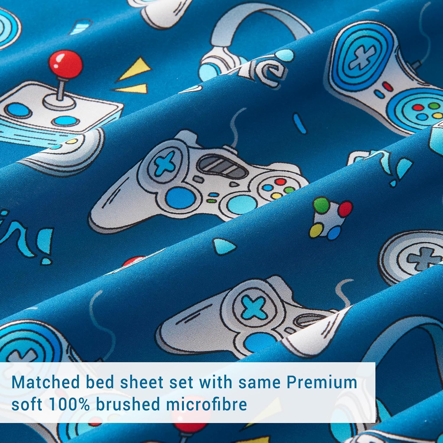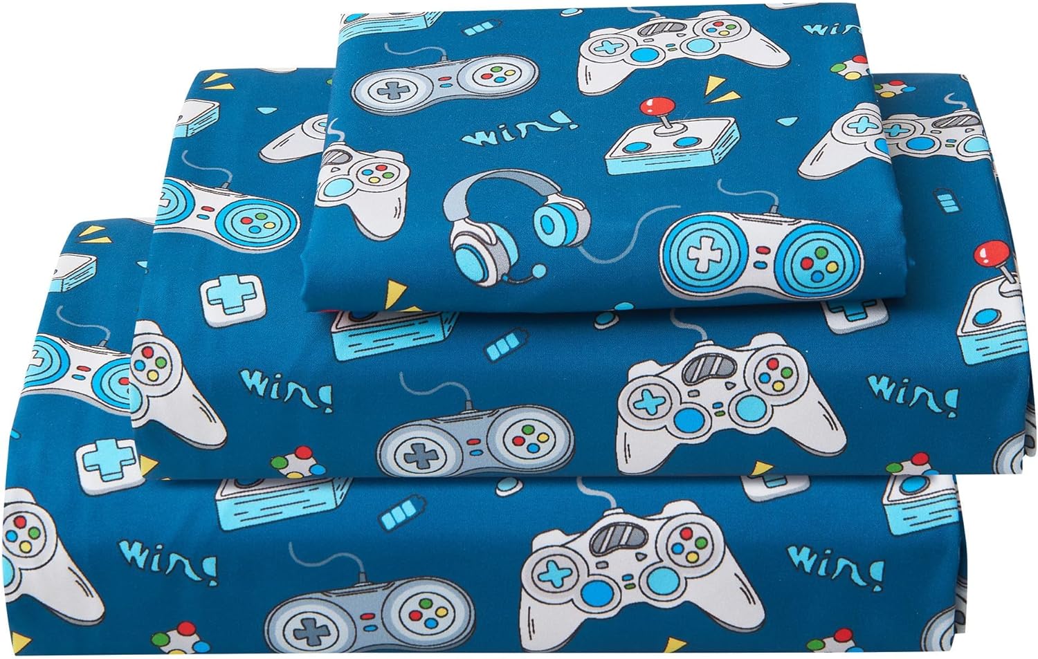 Soft, breathable, and stylish bedding designed for little gamers and dreamers. This Kids Bed Sheet Set is made from 100% double brushed microfiber, delivering a silky, comfortable feel that your little ones will love. The breathable fabric keeps them cool in warm weather and warm in cooler nights, making it perfect for all seasons. With a playful game controller printed design, bedtime becomes an exciting and fun-filled moment for children, helping them feel more connected to their favorite games. The set includes everything you need to create a cozy sleep environment: a flat sheet, a fitted sheet with a 12-inch deep pocket, and two pillowcases. The elastic all around fitted sheet ensures a secure fit for standard twin-sized beds, keeping your child's bedding in place overnight. These easy to care for sheets are machine washable and tumble dry safe, making maintenance a breeze and allowing the set to last for years of comfort and style. Whether youâre outfitting a new bedroom or refreshing an old one, this Kids Bed Sheet Set offers the perfect blend of comfort, durability, and playful charm. Itâs ideal for use with any comforter or bedding setup, making it an essential addition to your childâs room for a stylish and comfortable sleep experience.Game Controller Printed Kids Bed Sheet Set