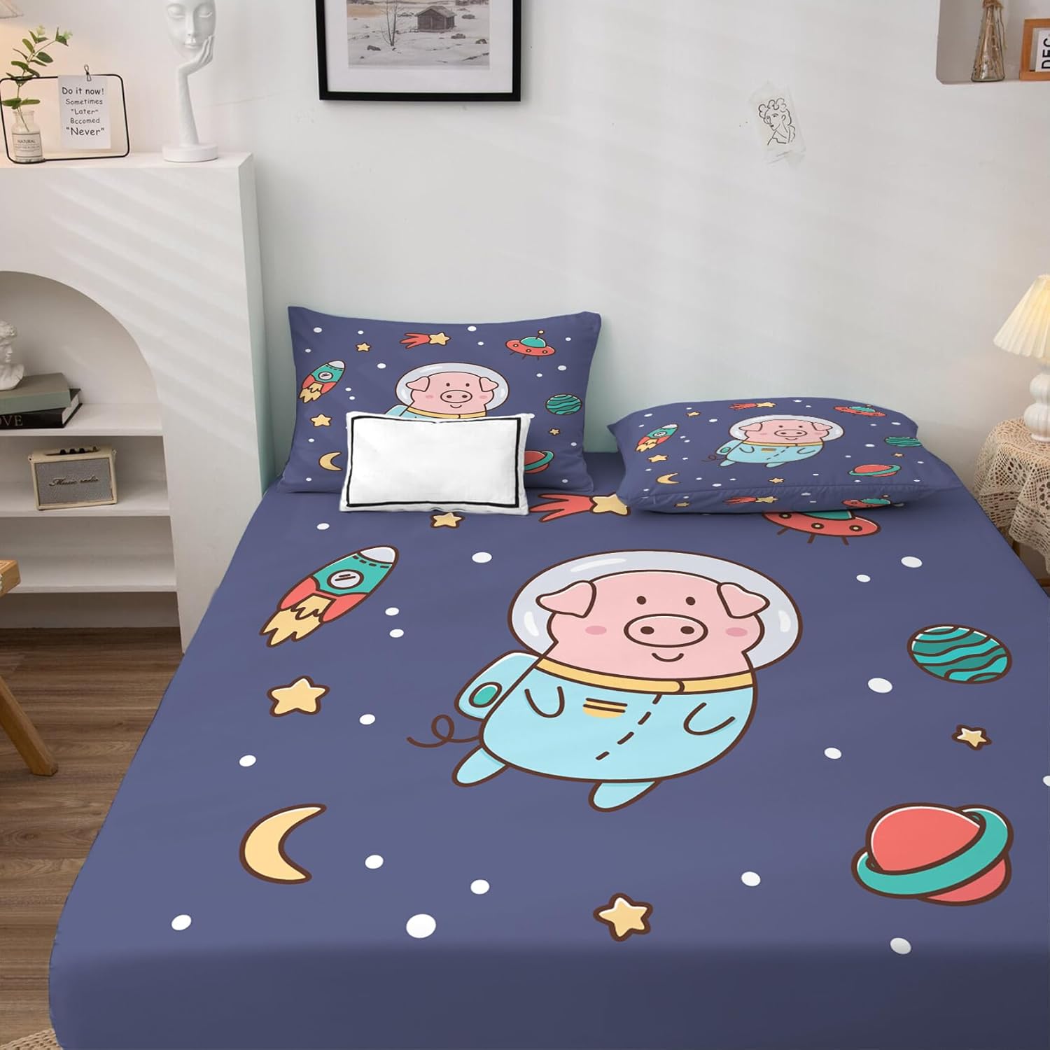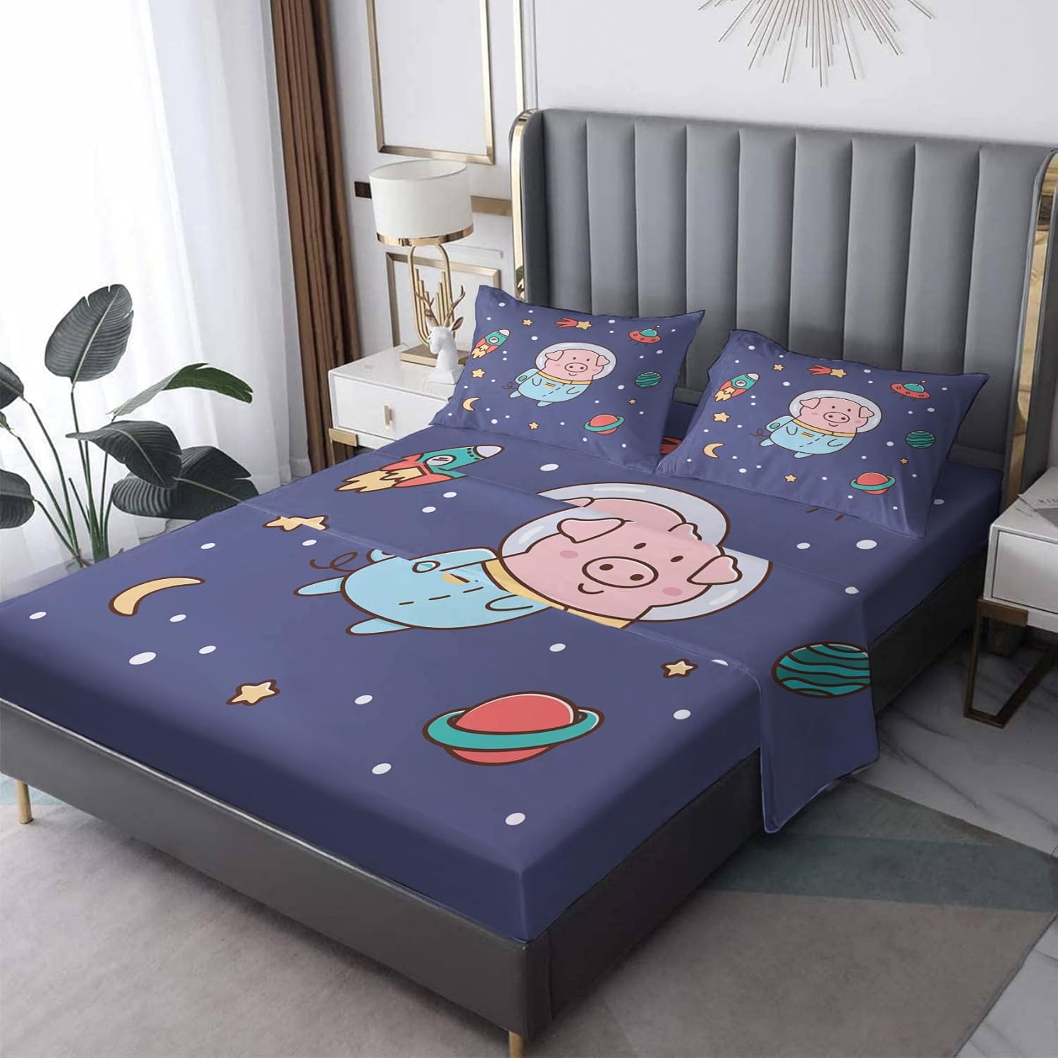 Transform your childâs bedroom with our 3-piece Kids Pig Sheet Set. Featuring a vibrant space-themed pattern, it adds a playful and imaginative touch to any room. Made from ultra-soft 100% brushed microfiber, these sheets are gentle on little skin and perfect for a restful nightâs sleep. The fitted sheet comes with all-around elastic to keep it secure and prevent shifting, ensuring reliable sleep every night. Its deep pockets accommodate thicker mattresses up to 16 inches, providing a snug and supportive fit. This sheet set is also wrinkle-free and sweat-resistant, making it easy to maintain and ideal for active children. With a softness that surpasses organic cotton and Egyptian cotton, these sheets offer unmatched comfort and durability. The set includes a flat sheet, fitted sheet, and standard pillowcase, all designed to complement each other for a cohesive look. Whether you're upgrading your childâs bedroom or looking for a fun gift, these sheets are a stylish and practical choice. Perfect for decorating kidsâ rooms, bedrooms, and even play areas, this space-themed bedding set brings a sense of adventure and whimsy. Machine washable and easy to care for, itâs the ultimate solution for parents who want to keep things simple and kids happy. Ideal for those searching for: kids pig sheets, space theme bedding, twin sheet set, microfiber bed sheets, and wrinkle free pillowcases.Kids Pig Sheet Set | Space-Themed Design for a Cozy Sleep Experience