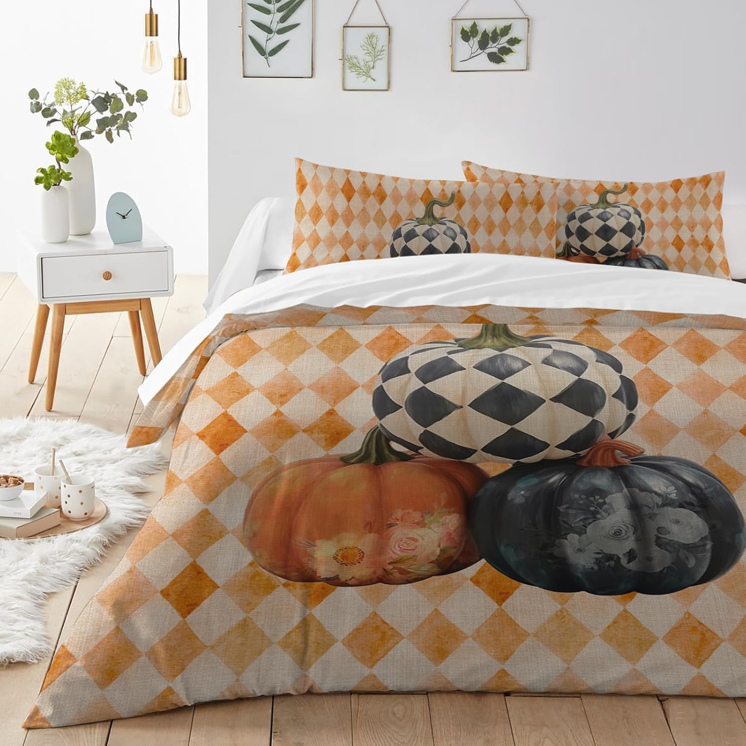 This stylish and functional duvet cover set is the perfect way to add warmth and charm to your space. With a cozy pumpkin pattern in an orange plaid design, it creates a welcoming atmosphere for your bedroom, making it ideal for fall or holiday decor.