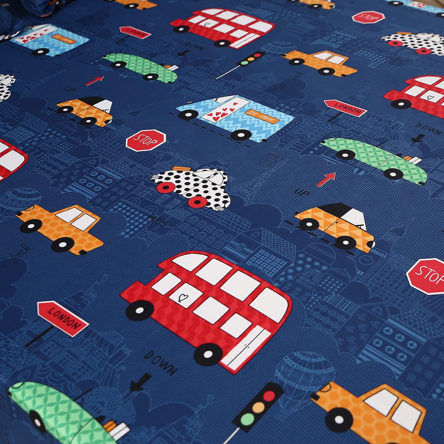 A 3-piece car-themed sheet set for kids and teens, featuring 1 fitted sheet and 2 pillowcases. Made from soft, breathable, and durable organic polyester microfiber. Perfect for bedding and gift ideas, with cute designs for car lovers.