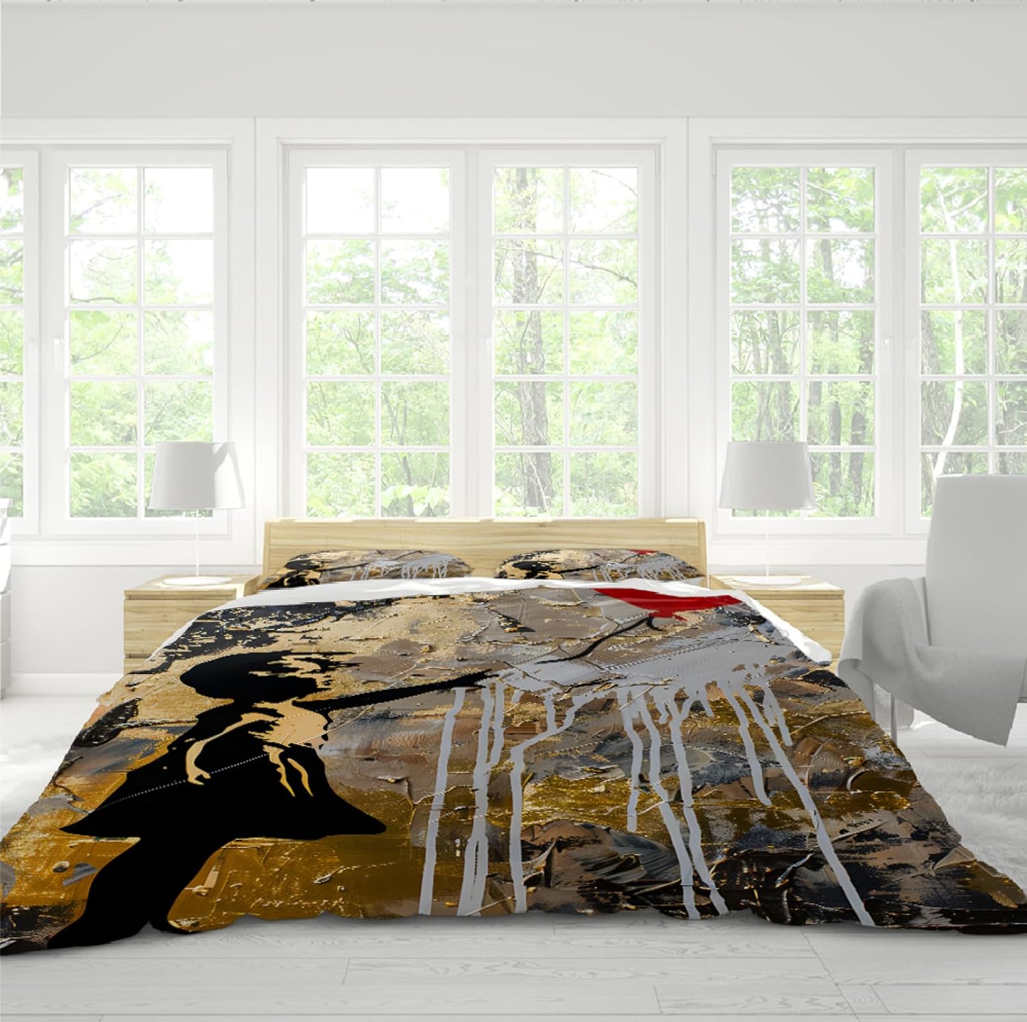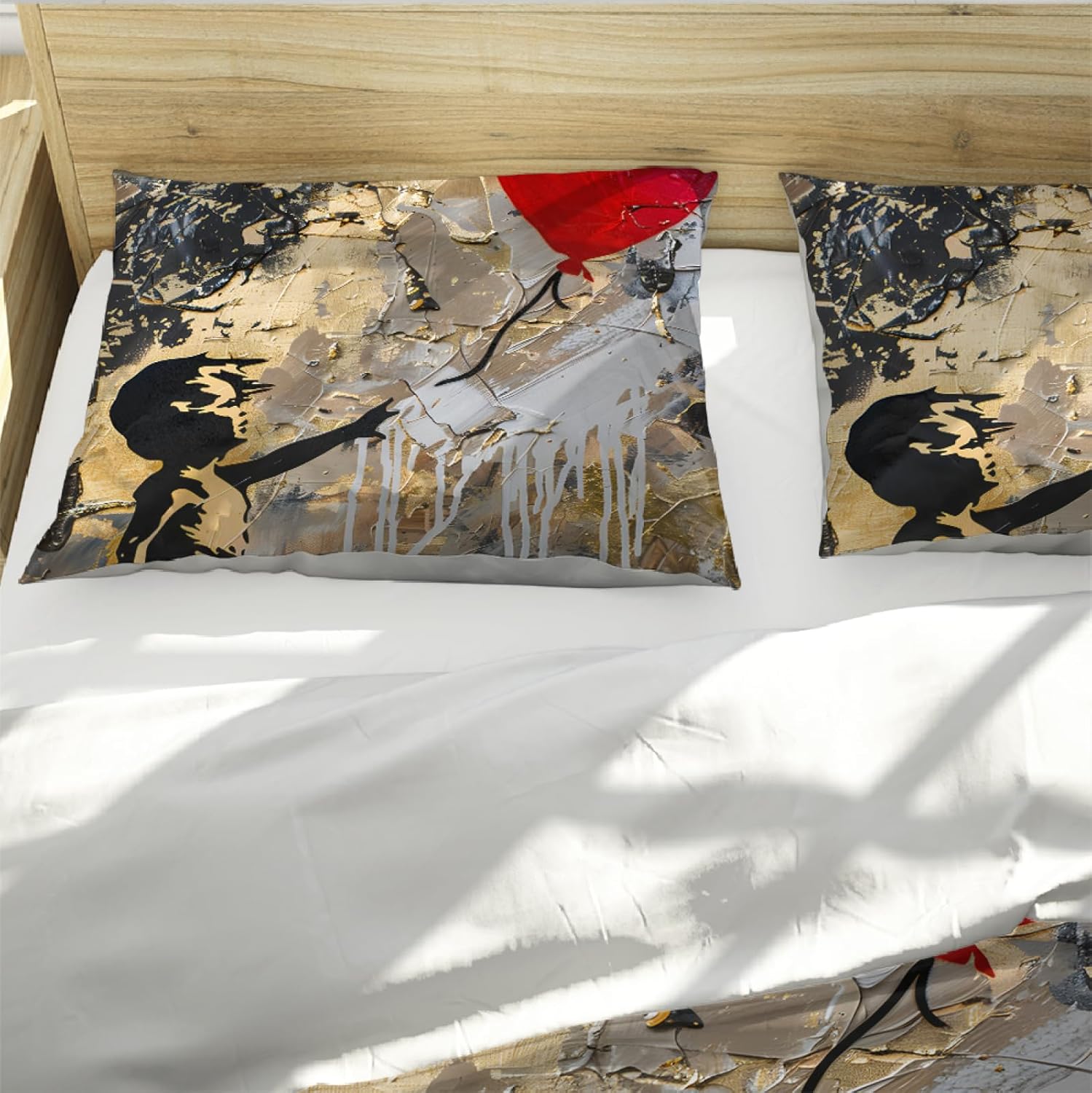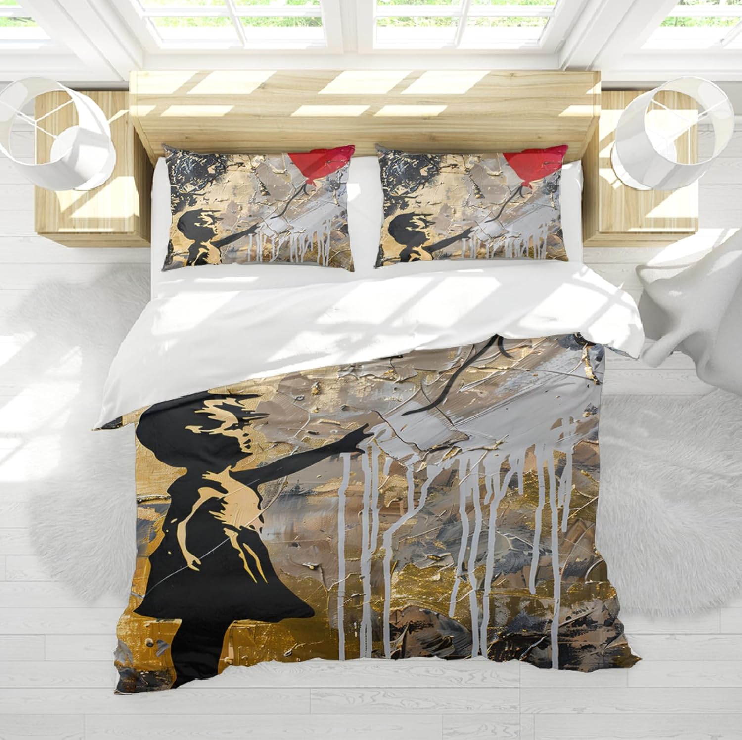 Add a bold artistic statement to your bedroom with this stylish 3-piece duvet cover set. Inspired by street graffiti art, the vibrant red balloon girl design brings a unique and eye-catching look to your space. The 3D effect ensures that the artwork remains stunning and dynamic, no matter the size of the bed. Crafted with quality materials, this set is designed to maintain its color and durability even after multiple washes.