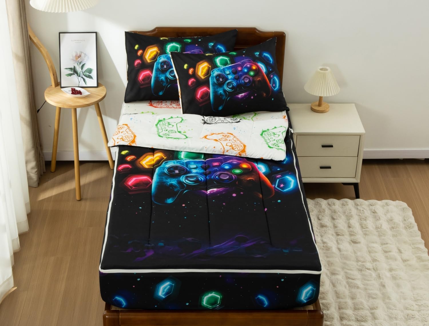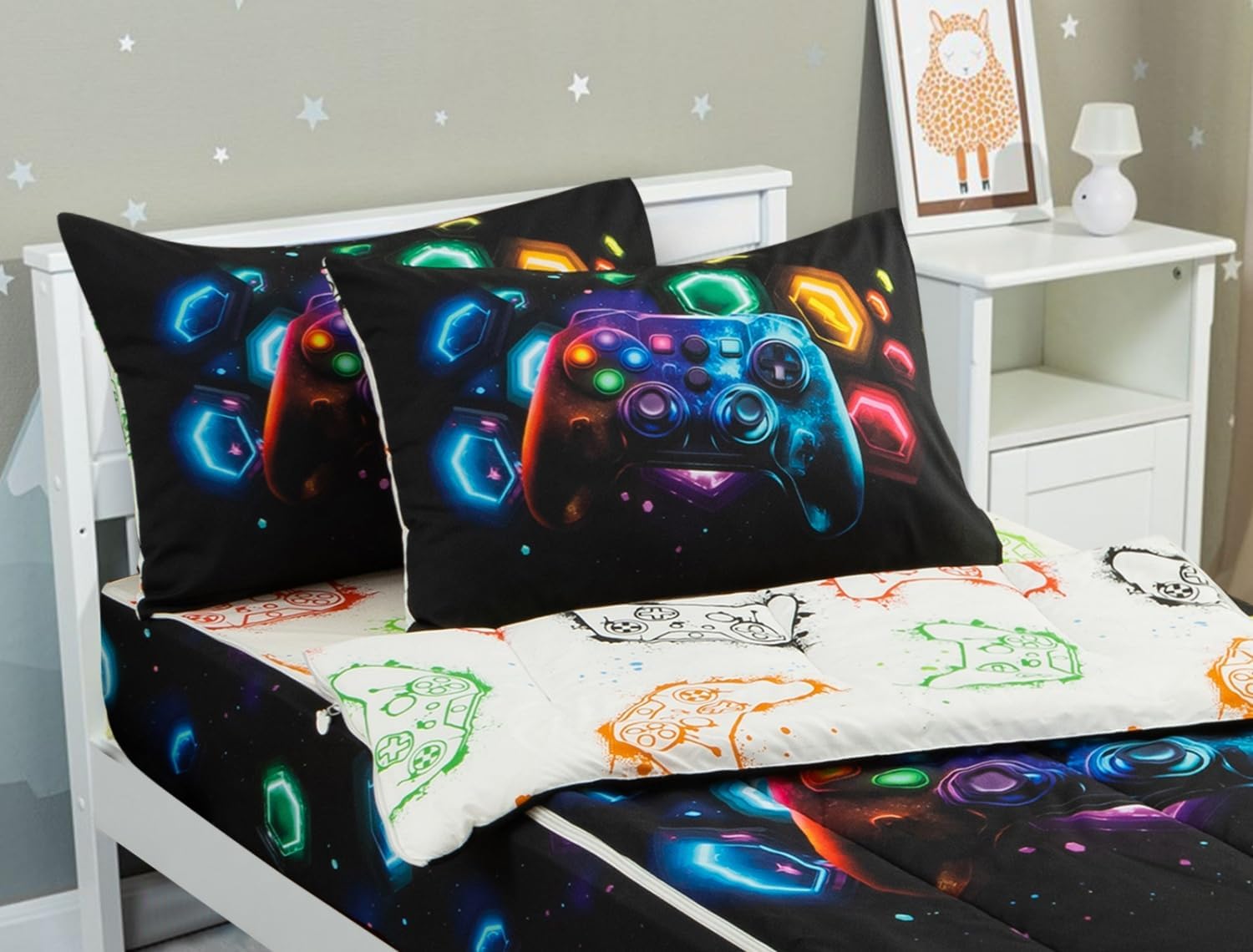 Adorned with fun universe and gaming-themed patterns, this set is designed to capture the imagination of young boys. It's not just beddingâit's an adventure waiting to happen in every corner of the room.