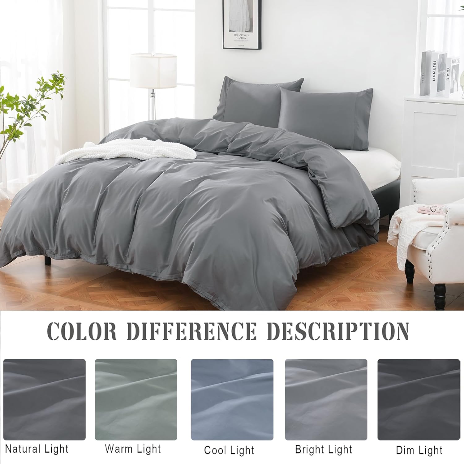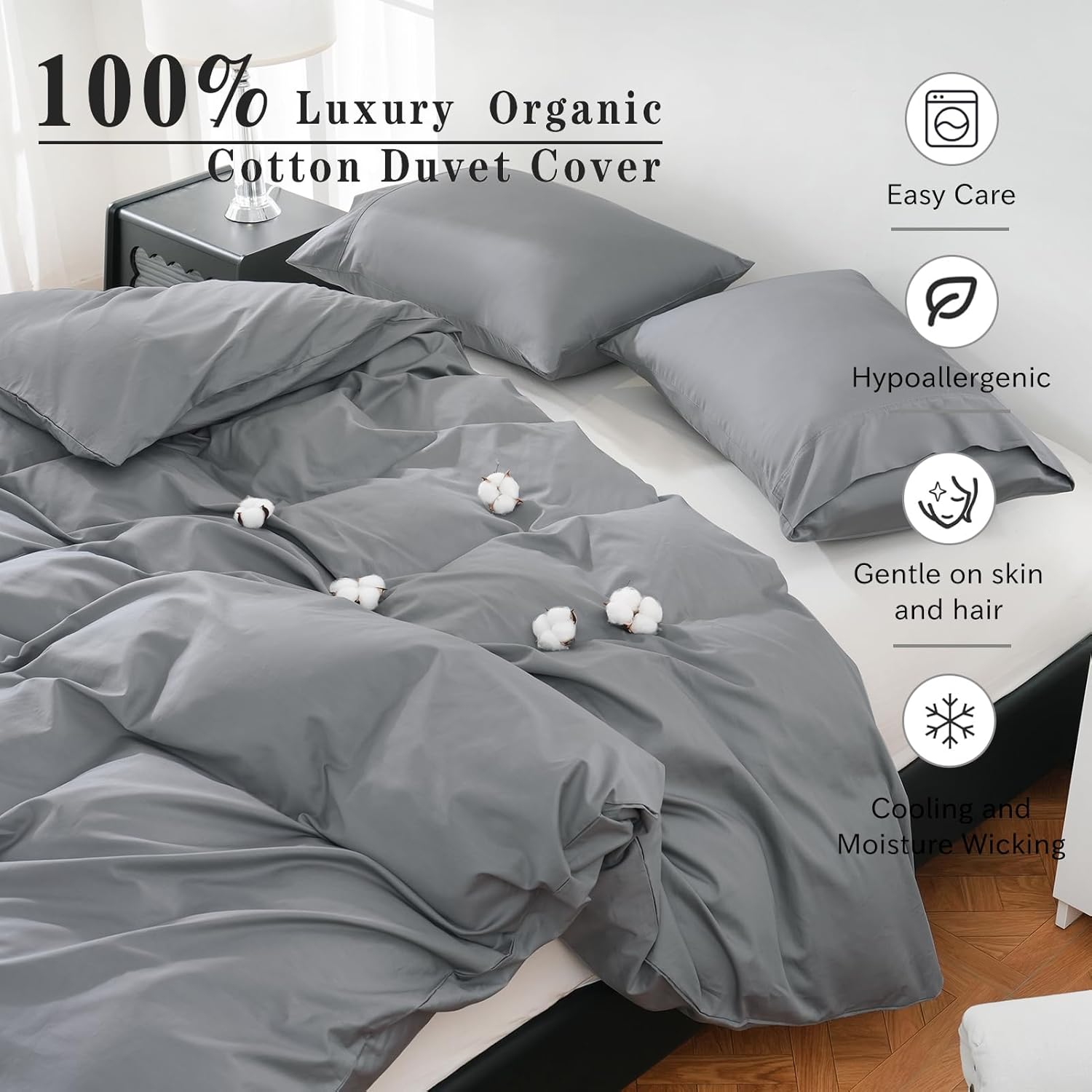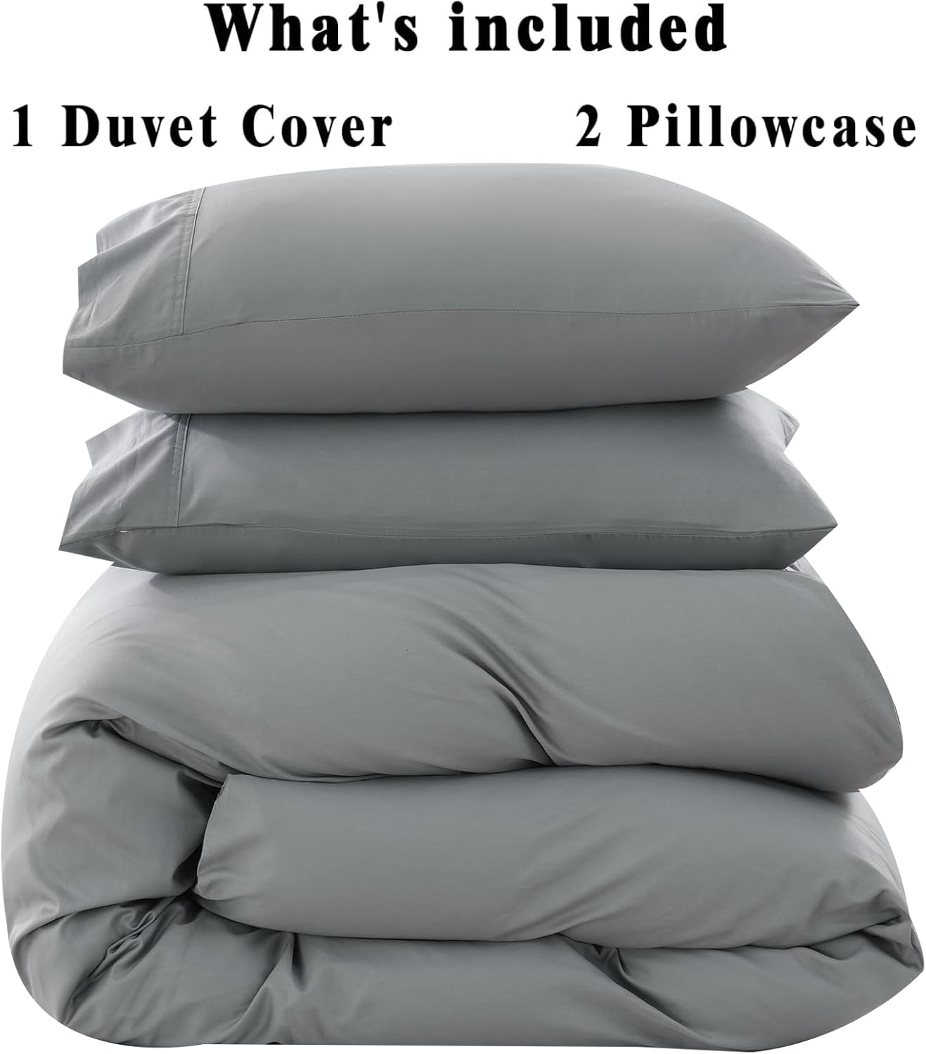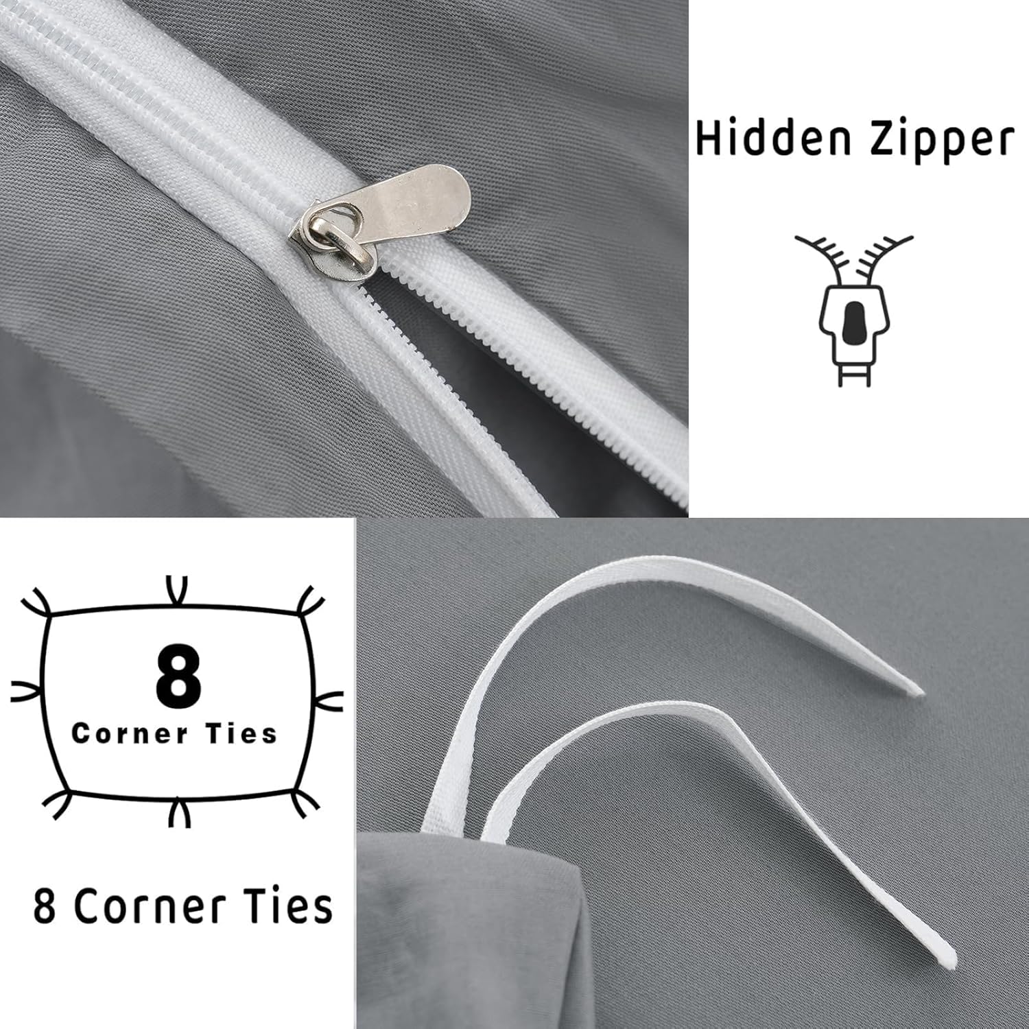 Perfect for couples or individuals, the California King duvet cover and two coordinating pillowcases come together as a cohesive set that enhances your bedroomâs overall look. The subtle grey hue adds a modern, sophisticated vibe to any decor, while the hidden zipper closure and eight corner ties provide a secure, snug fit for worry-free use.