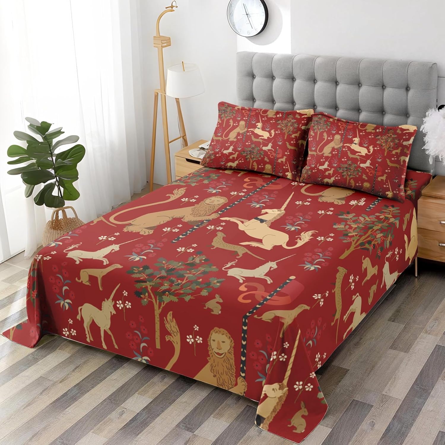 Elevate your bedroom with the Pamnest Full Size Bed Sheet Set, designed to bring a touch of regal charm and timeless style to your space. The enchanting Medieval Beige Lion pattern adds a unique visual appeal, making it an ideal choice for those who love classic and sophisticated room decor.