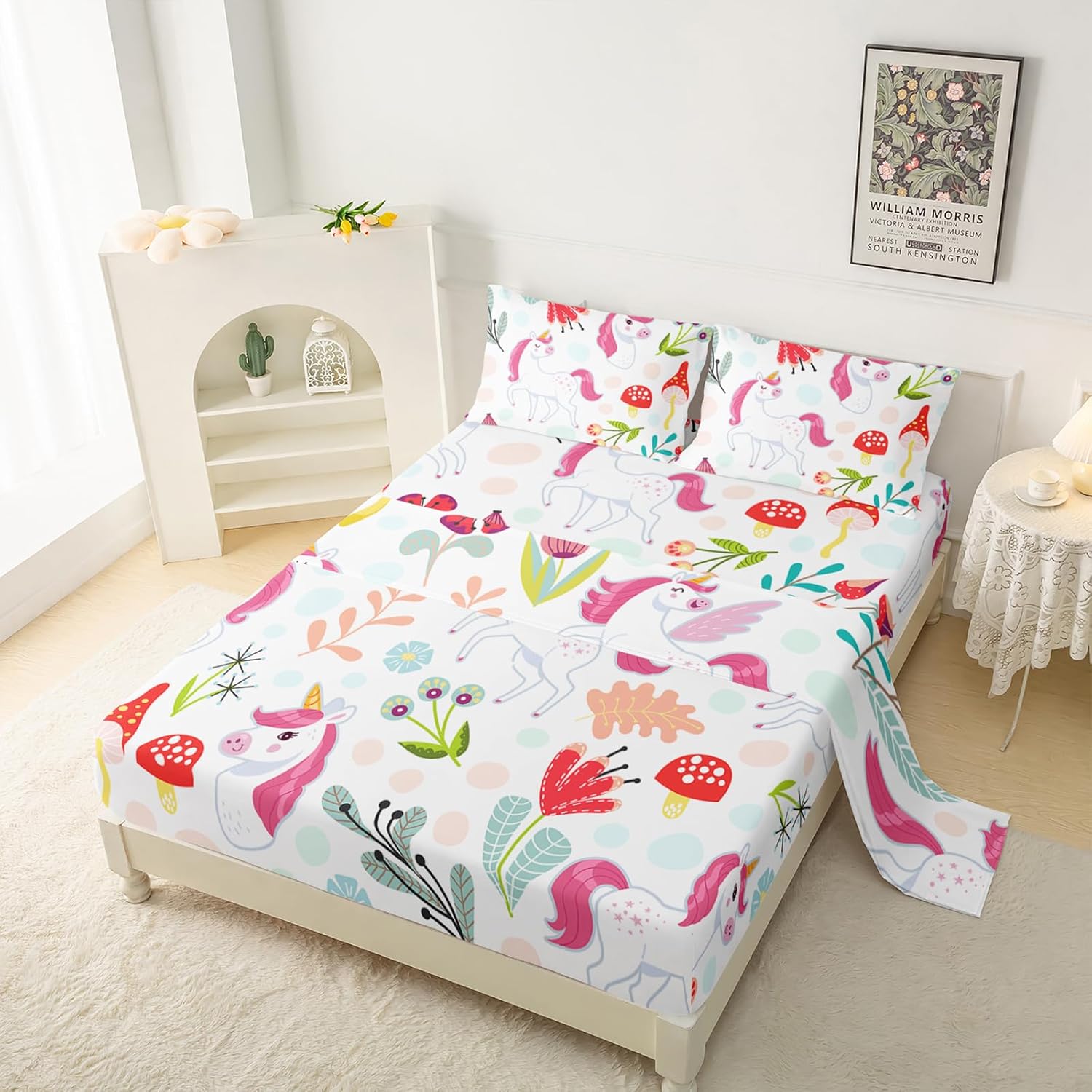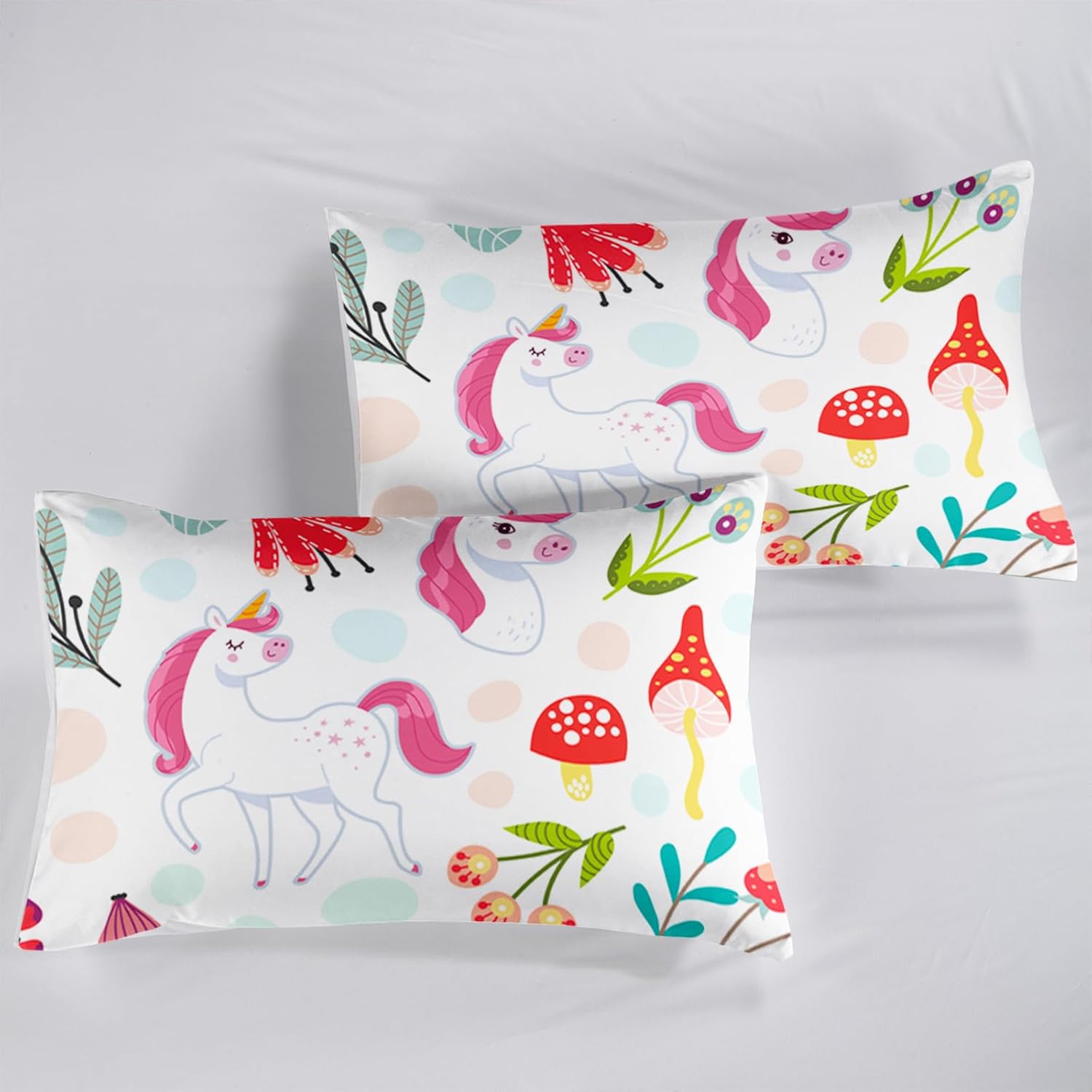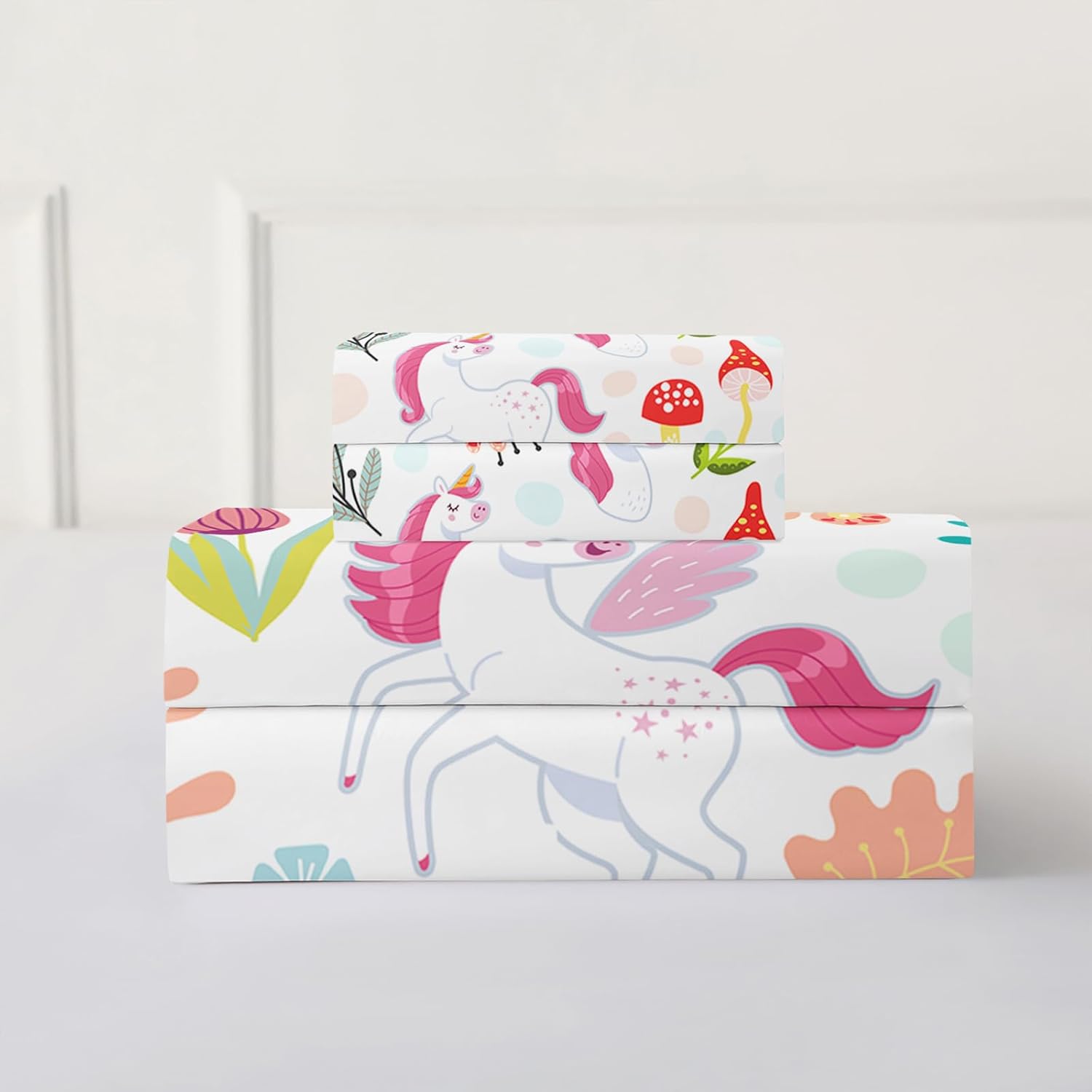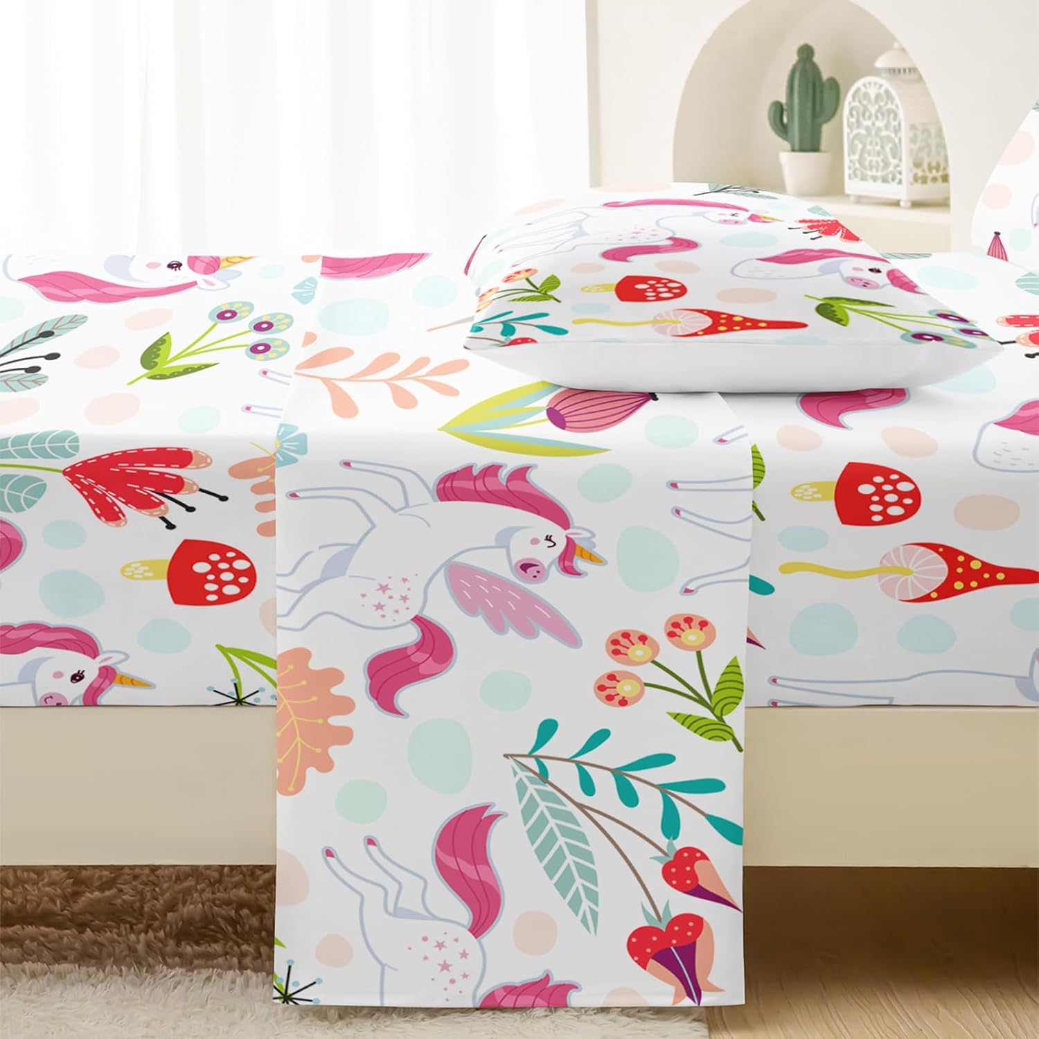 Transform your child's bedroom into a dreamy wonderland with the QOOMO Cartoon Unicorn Kids Sheet Set. Featuring a vibrant design of playful unicorns and colorful flowers, this bed set brings a touch of whimsy and charm that delights both children and parents. The queen size set includes one fitted sheet, one flat sheet, and two pillowcases, offering a complete and cozy solution for any young room. This Kids' Sheet Set is an excellent gift for birthdays, Mother's Day, Father's Day, or Christmas. It offers the perfect opportunity to personalize your child's room with a unique and playful decor theme, encouraging creativity and comfort in every bedtime. The Flowers Pattern Bedding, combined with the Cooling Mushroom Print Sheets, ensures a stylish and cozy sleep experience that your child will love.QOOMO Kids Sheet Set â Magical Unicorn & Flowers Pattern
