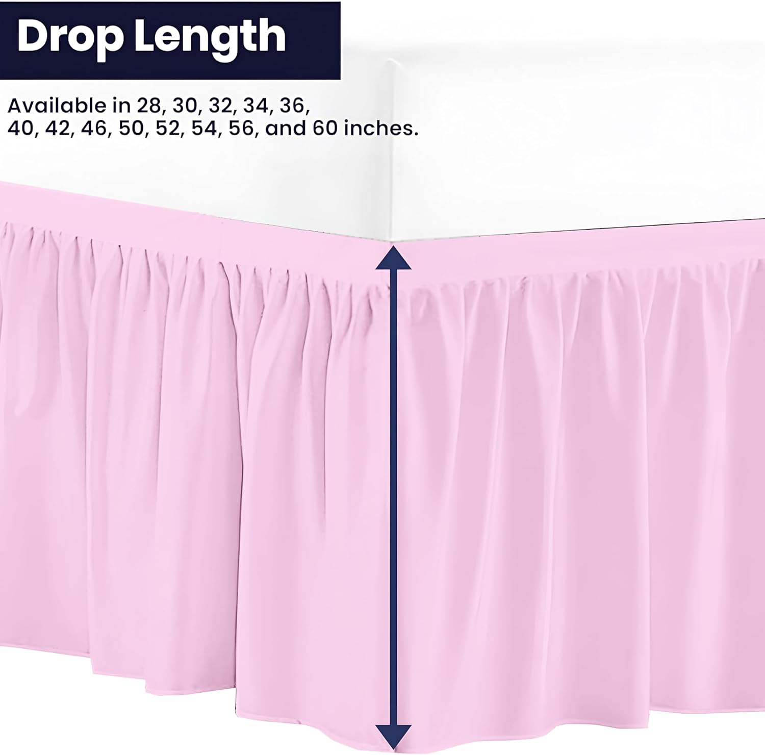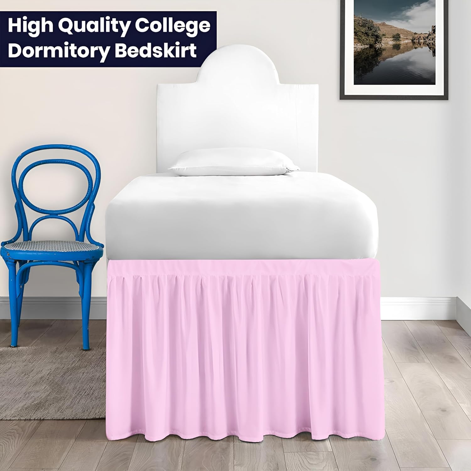 This ruffled dorm bed skirt adds a touch of elegance to any room with its soft texture and vibrant pink color. With a 36-inch drop length, it offers flexibility in design and provides a clean, seamless appearance when placed between your mattress and bed frame. Itâs an ideal choice for anyone who values both style and practicality in their bedding setup.