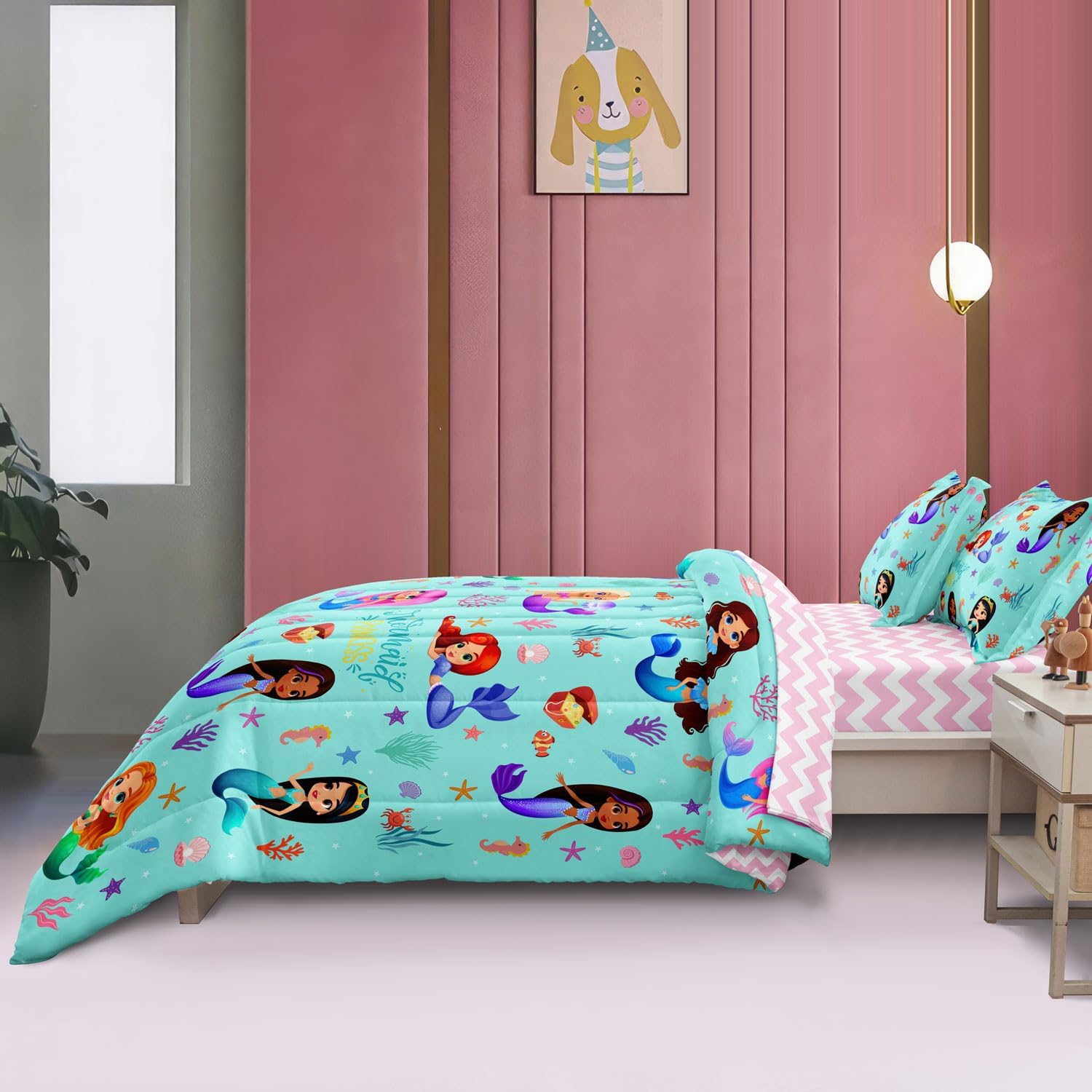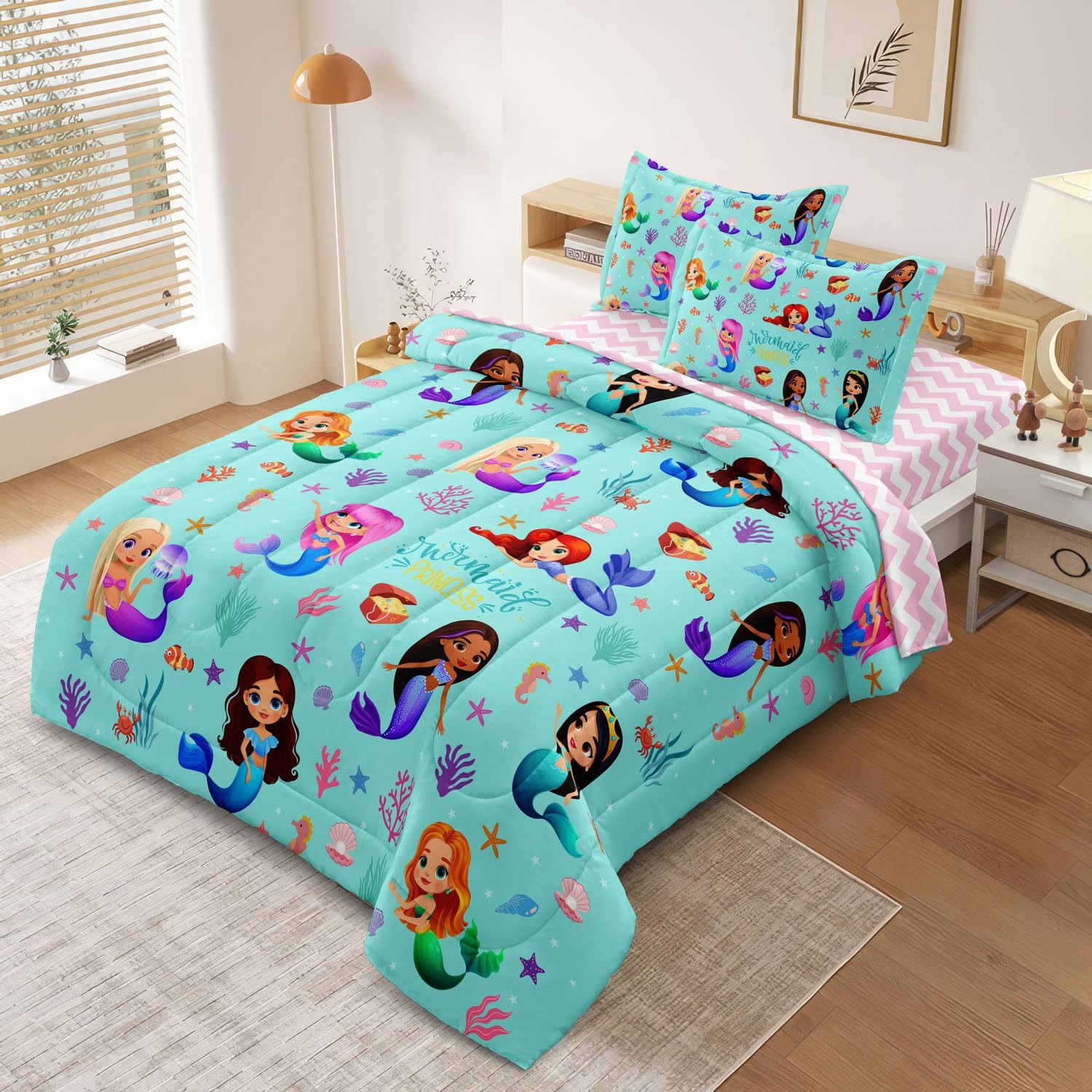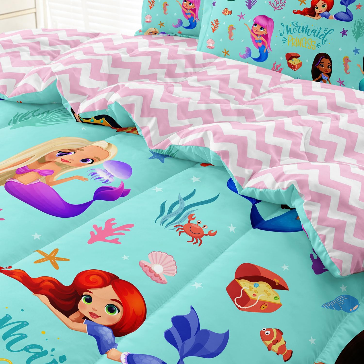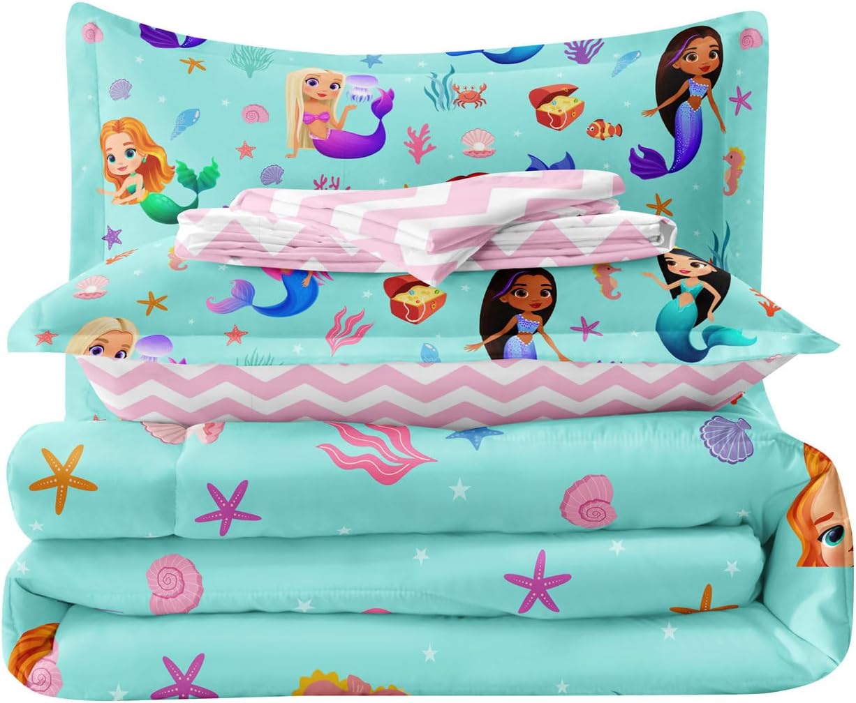 Boasting a charming mermaid and sea theme design, it brings a playful and whimsical touch to any childâs bedroom or nursery. The vibrant colors and cute cartoon patterns add a touch of joy to your childâs space, making it a delightful addition to their personal style. Plus, the easy-wash feature ensures that it stays fresh and clean with minimal effort, while the compact roll-up design makes it simple to store and travel with. Perfect for kids, this bed in a bag is also an ideal gift for a girl, suitable for home, school, or even an RV.