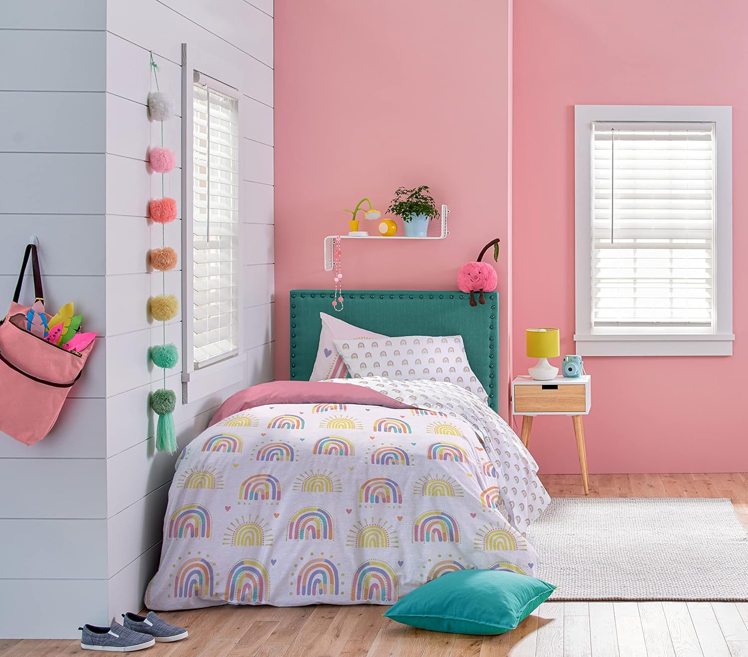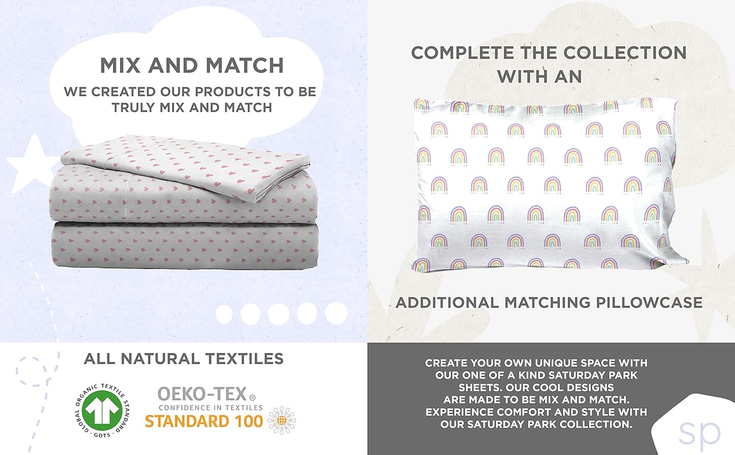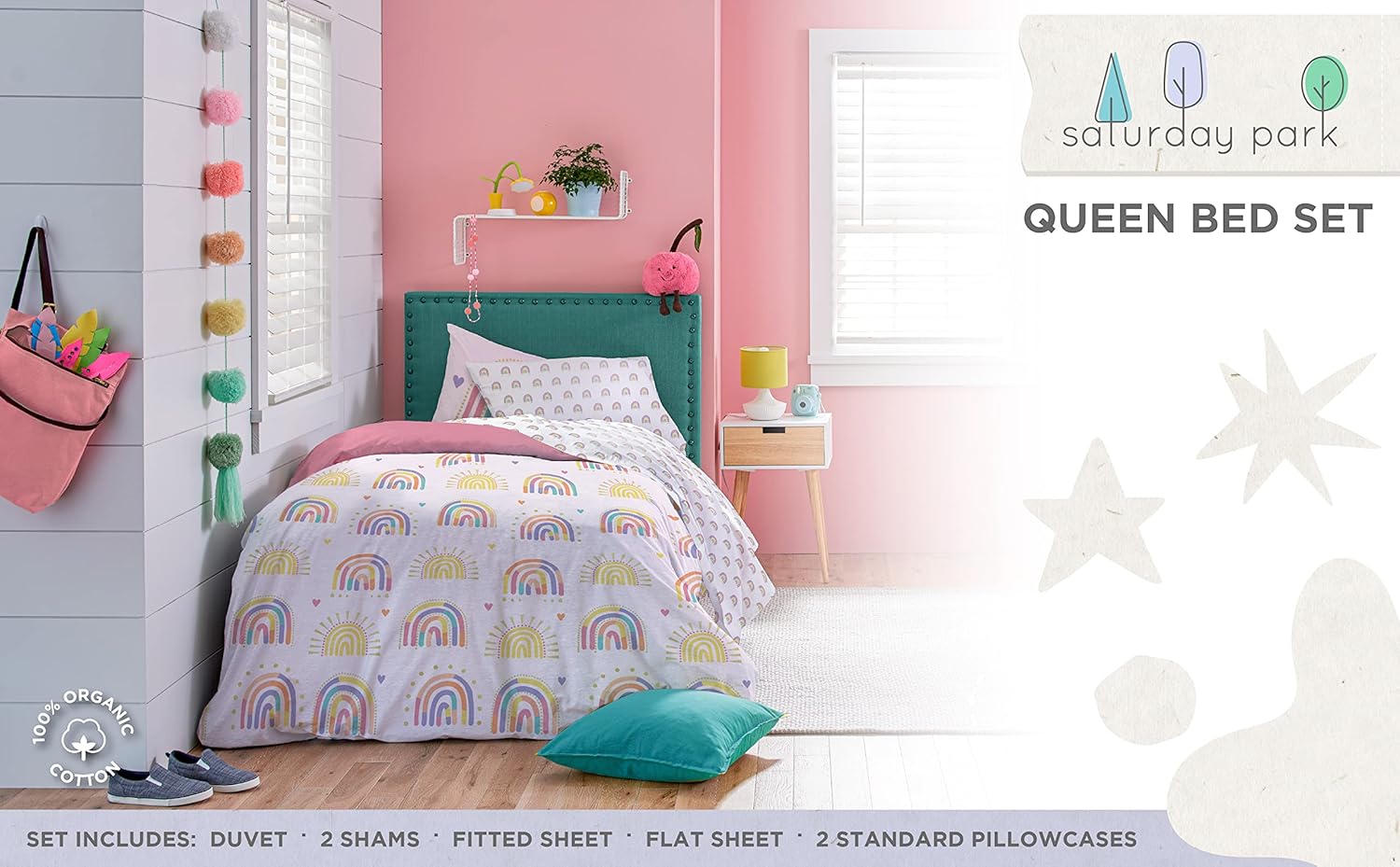Transform your child's bedroom into a magical space with this 7-piece rainbow queen bed set. Designed to bring joy and comfort, it includes a queen duvet cover, fitted sheet, flat sheet, and coordinating pillowcases, all made from 100% organic cotton. The cheerful rainbow and sun patterns create a vibrant and playful atmosphere, while the soft, breathable fabric ensures a comfortable sleep all year round. This eco-friendly bedding set is not only stylish but also safe, thanks to its GOTS and Oeko-TEX certifications. Ideal for nurseries, playrooms, or childrenâs bedrooms, it offers a perfect fit and elevated design that makes styling easy. The fade-resistant fabric guarantees long-lasting beauty, and simple care instructions make it effortless to keep clean. Give your little one a cozy, safe, and sustainable sleep environment theyâll love.
