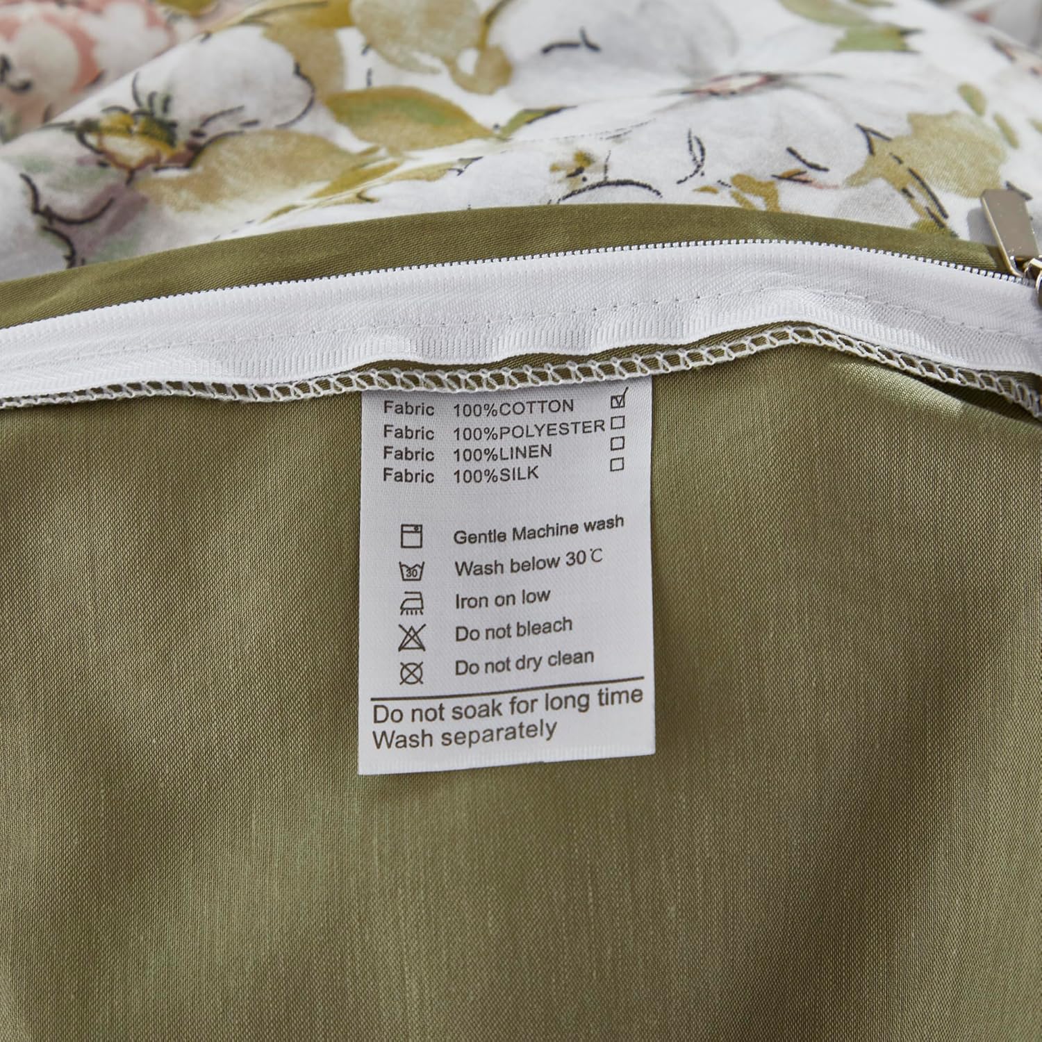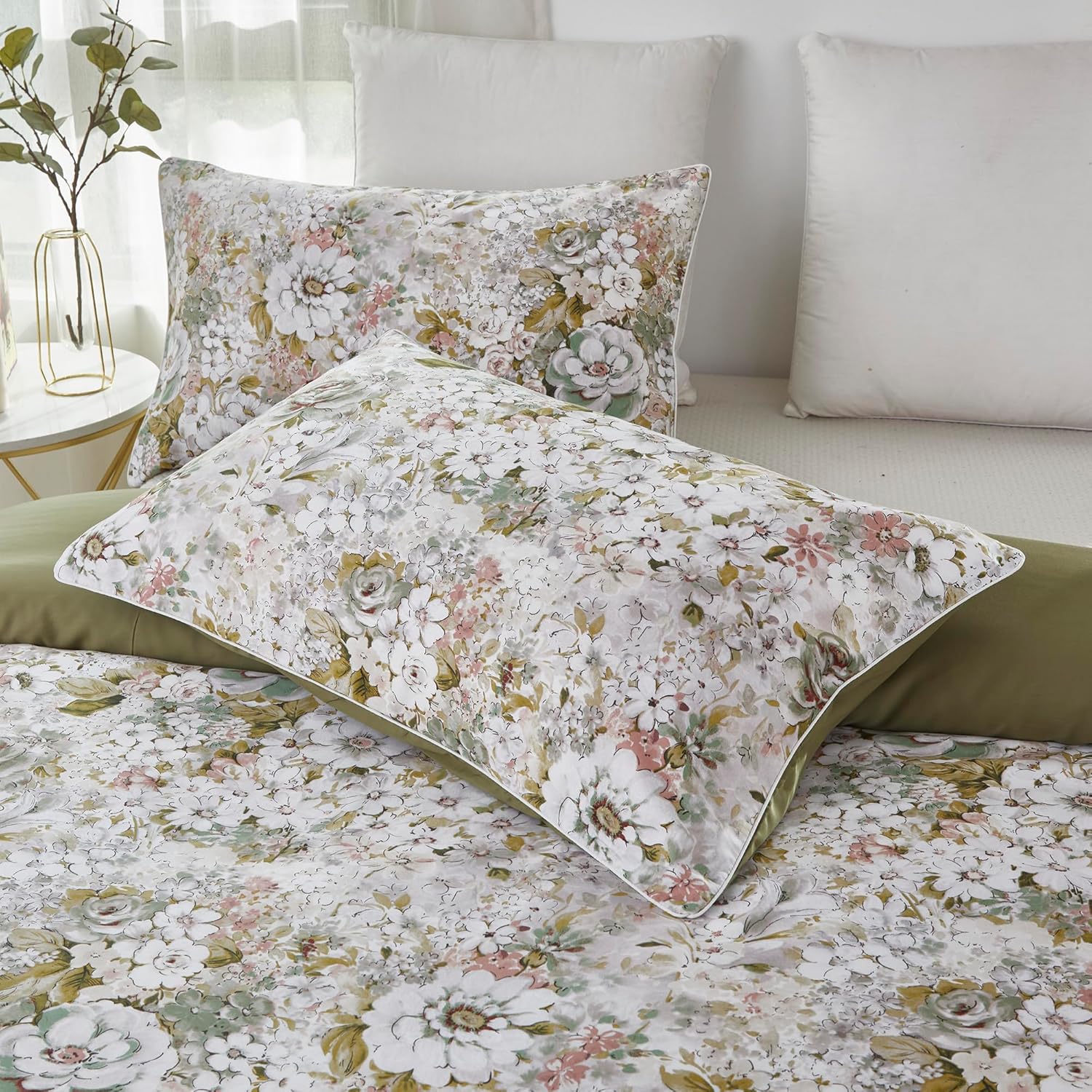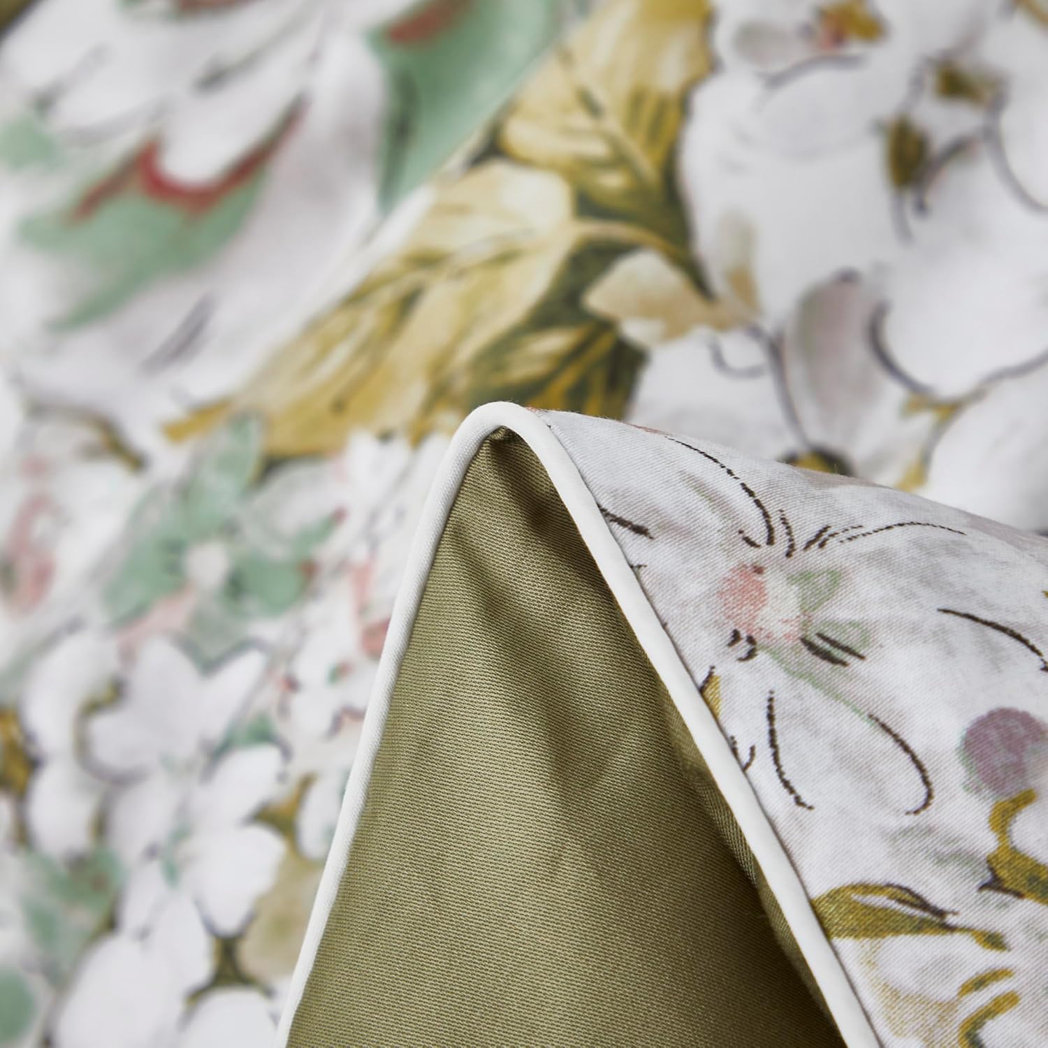 Elevate your bedroom with this exquisite boho duvet cover set, featuring a soft white flower design paired with a sophisticated khaki green solid. The set is crafted from 100% cotton, ensuring a gentle and breathable feel perfect for sensitive skin. With its elegant piping stitching and secure corner ties, this bedding set combines durability with a touch of artistry.