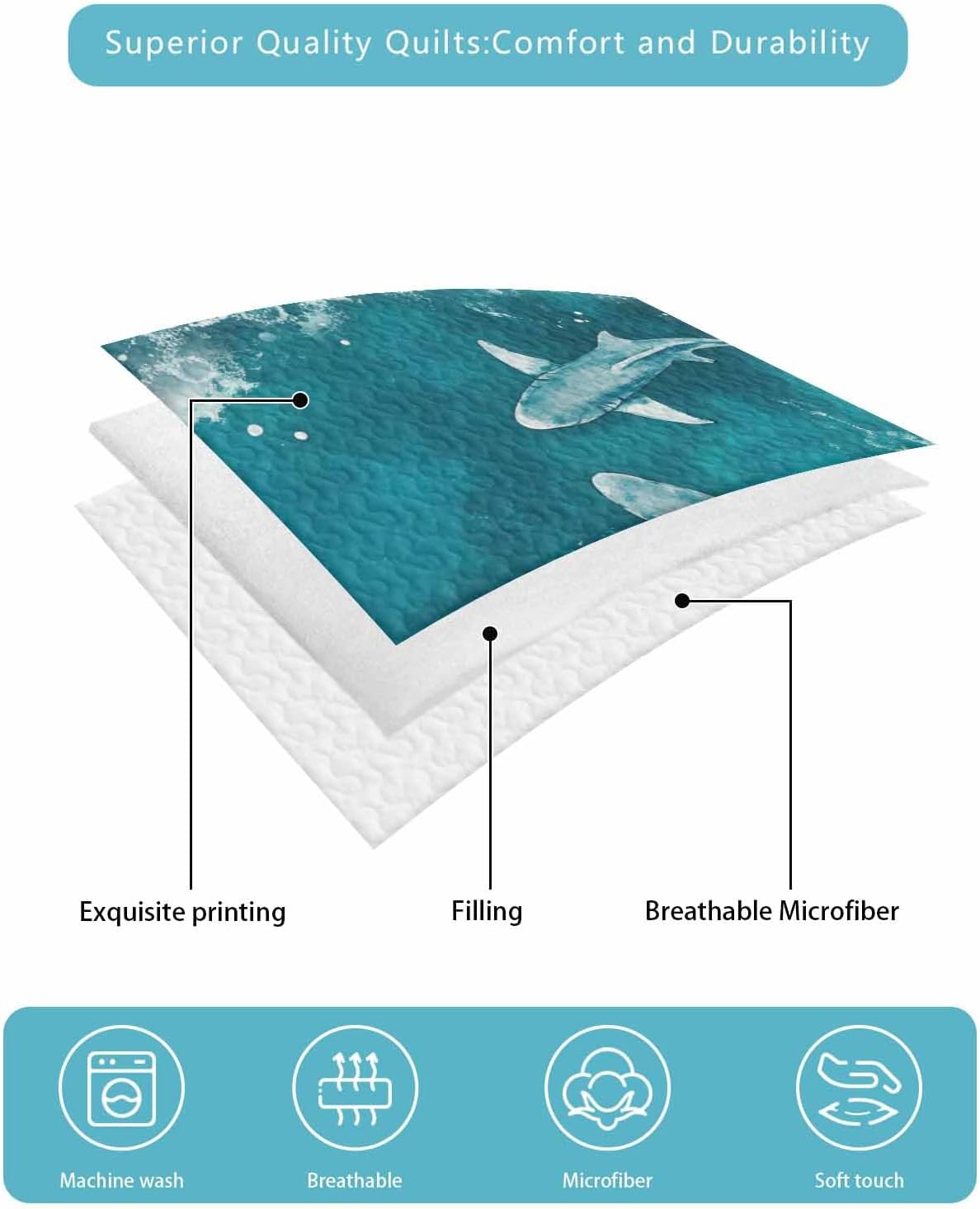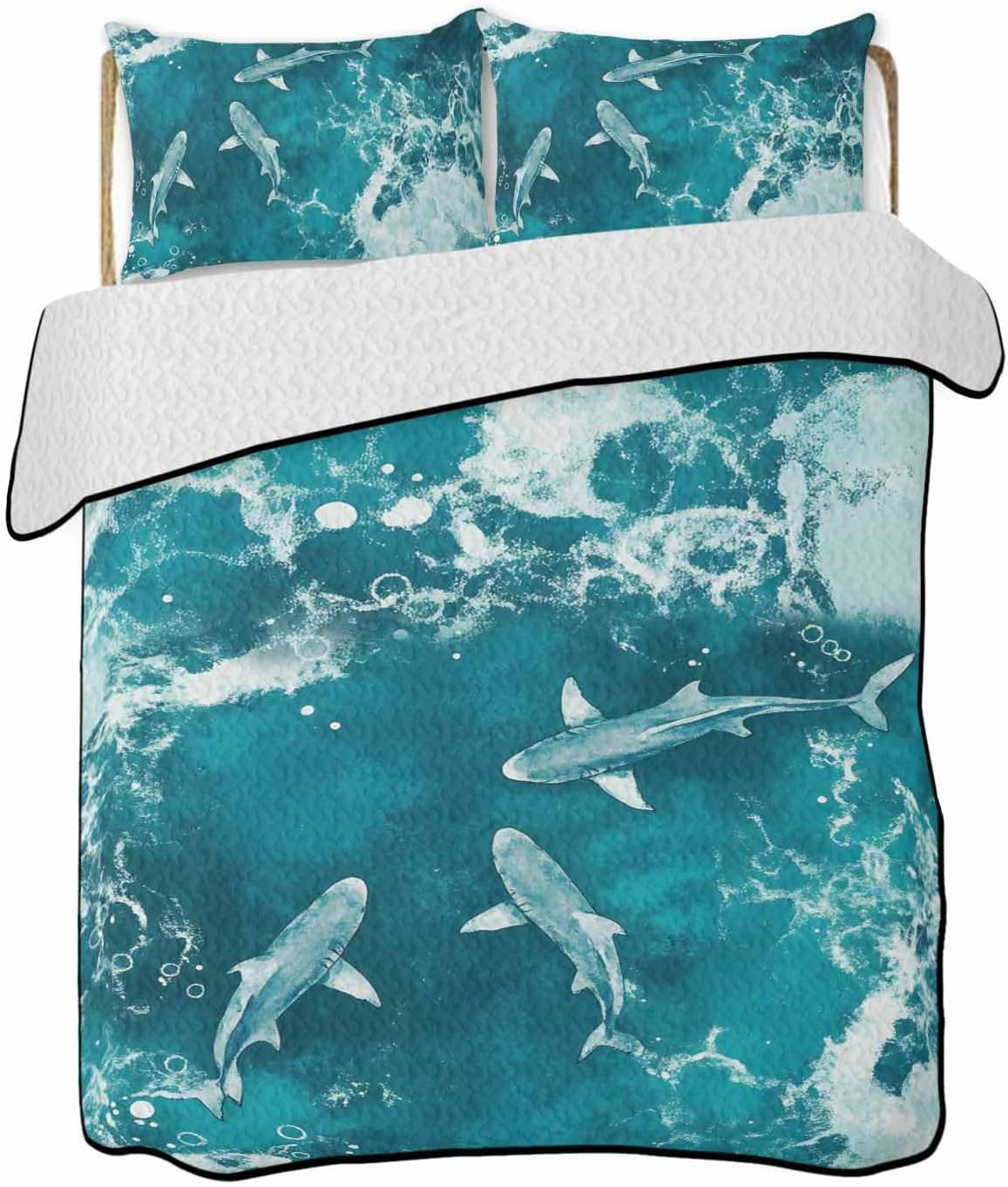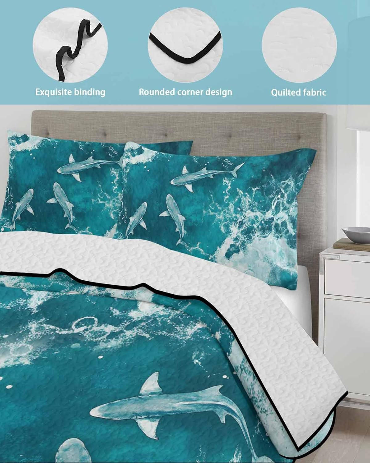 The set includes 1 quilt and 2 pillow shams, providing complete coverage and a soft drape that stays in place even when you move. With its vibrant teal green ocean shark pattern, this comforter set transforms your bedroom into a fresh, on-trend space. It's not only visually appealing but also built to last, with fade and shrink-proof quality that ensures long-term use without compromising on style.