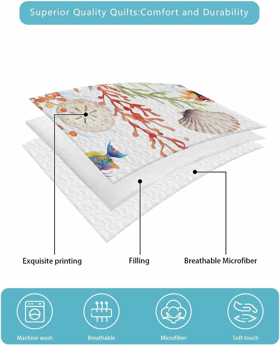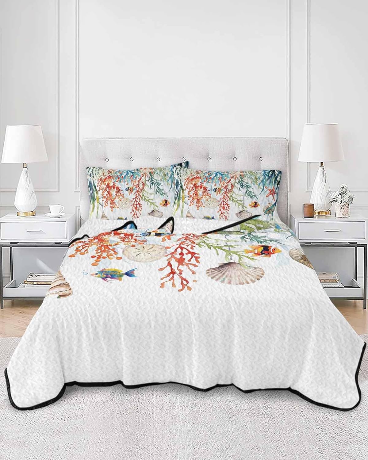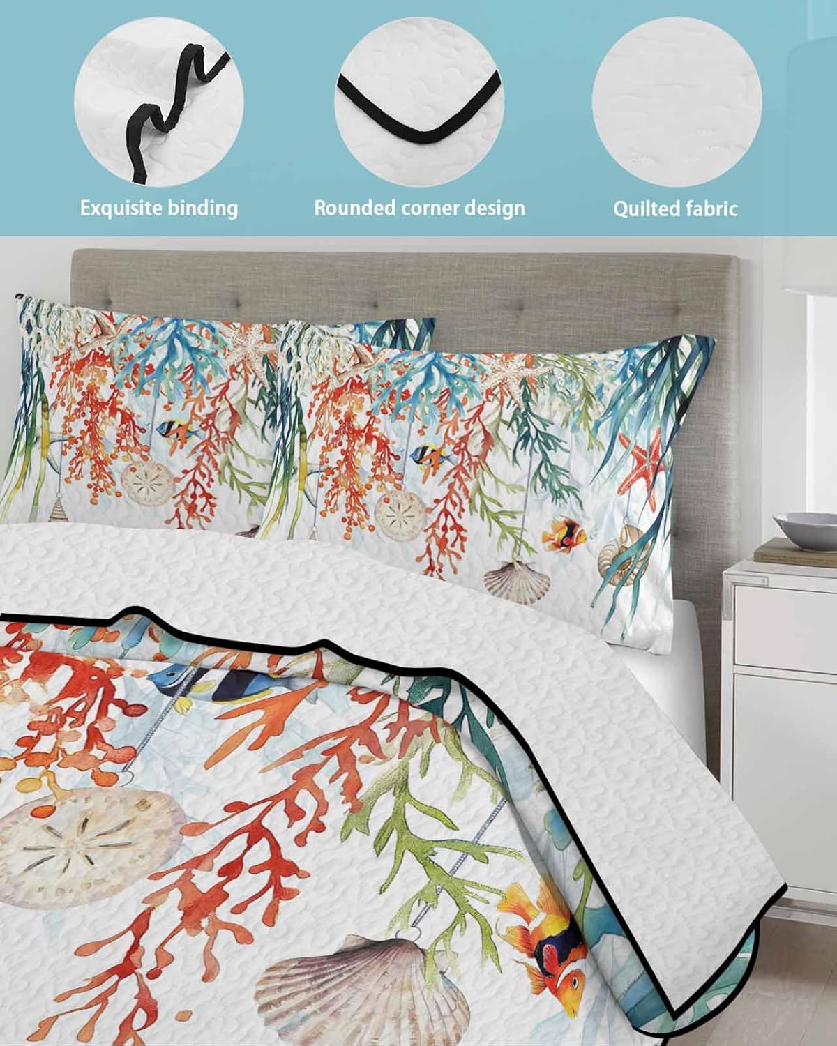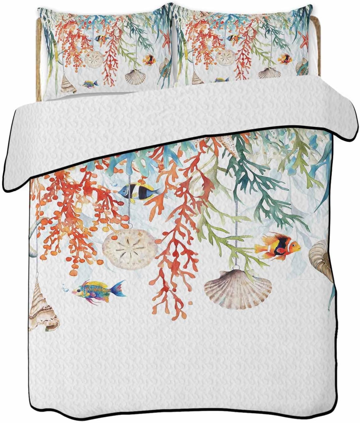 The set includes one 96x106" twin XL quilt and two 20x26" pillow shams, ensuring complete bedding coverage for any standard or thicker mattress. Its soft yet durable construction resists pilling and retains its shape after multiple washes, while the vibrant coastal patterns add a stylish touch of ocean and coral inspiration to your living space.
