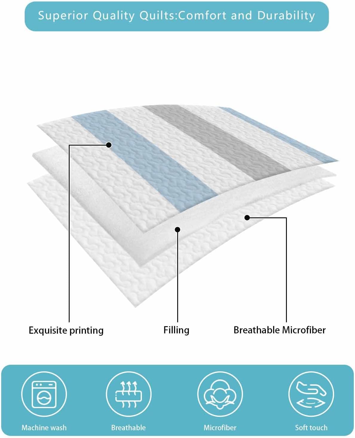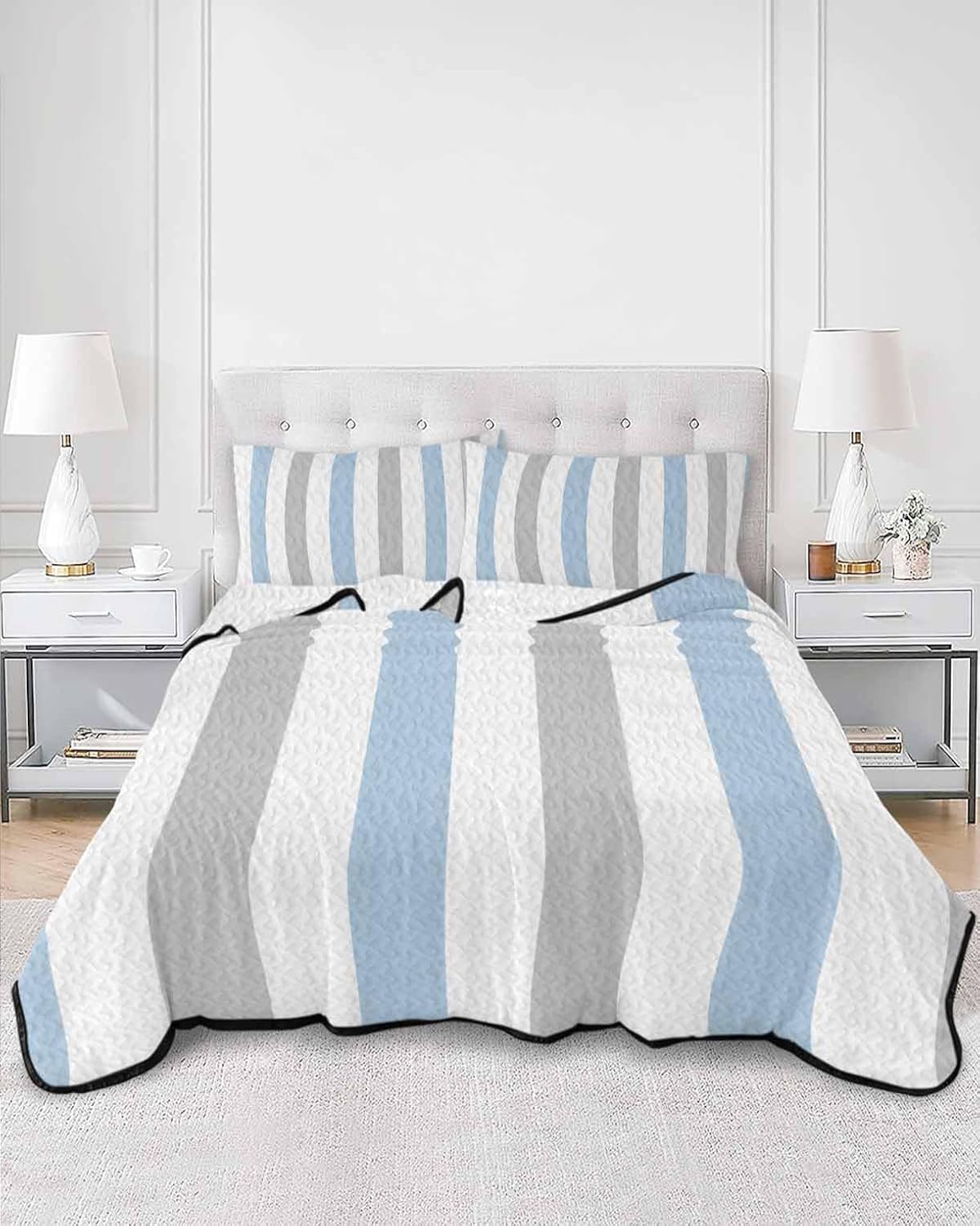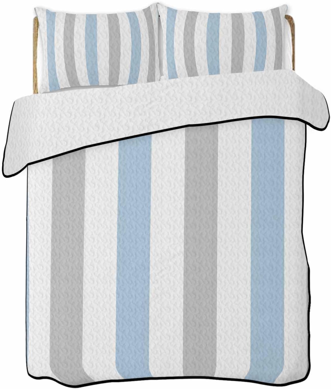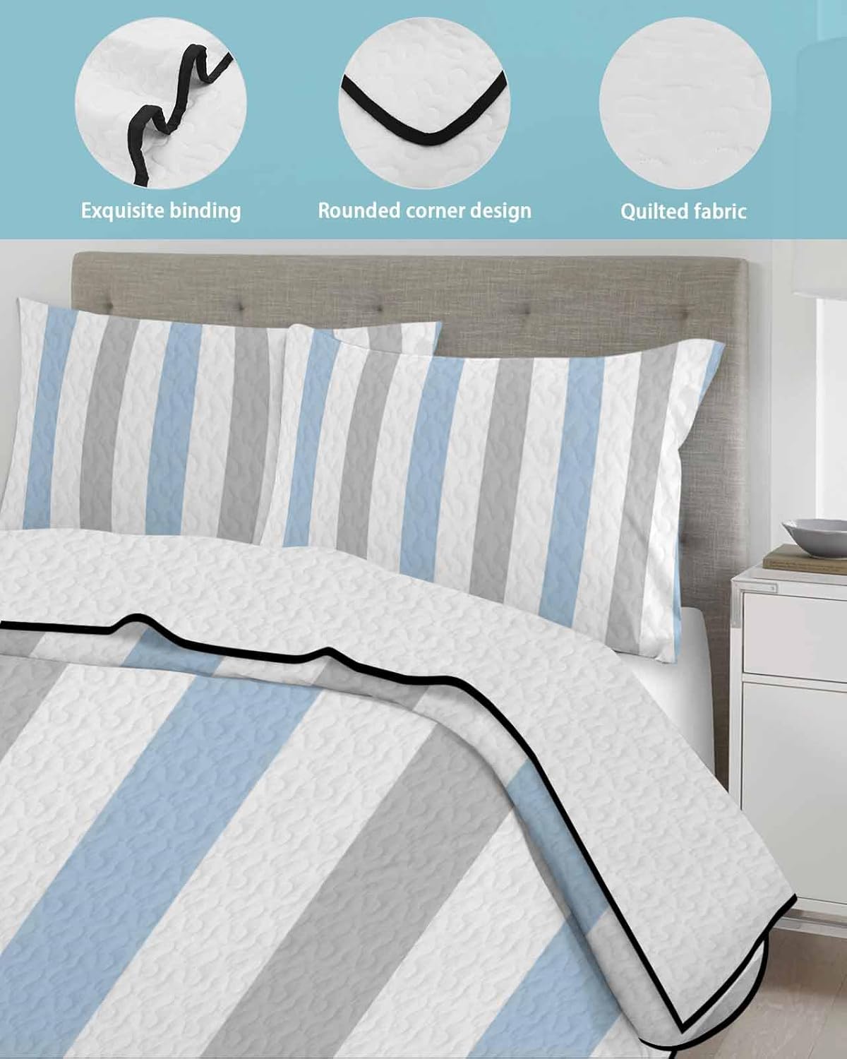 Add a touch of farmhouse charm to your room with this stylish quilt set. Featuring a modern vertical blue and grey stripe design, it effortlessly brings a sleek and contemporary feel. The 3-piece set includes a quilt and 2 coordinating pillow covers, offering both practicality and a cohesive look that can transform any space. Its secure stitching ensures the quilt stays in place, even during the night, providing a peaceful and uninterrupted sleep.