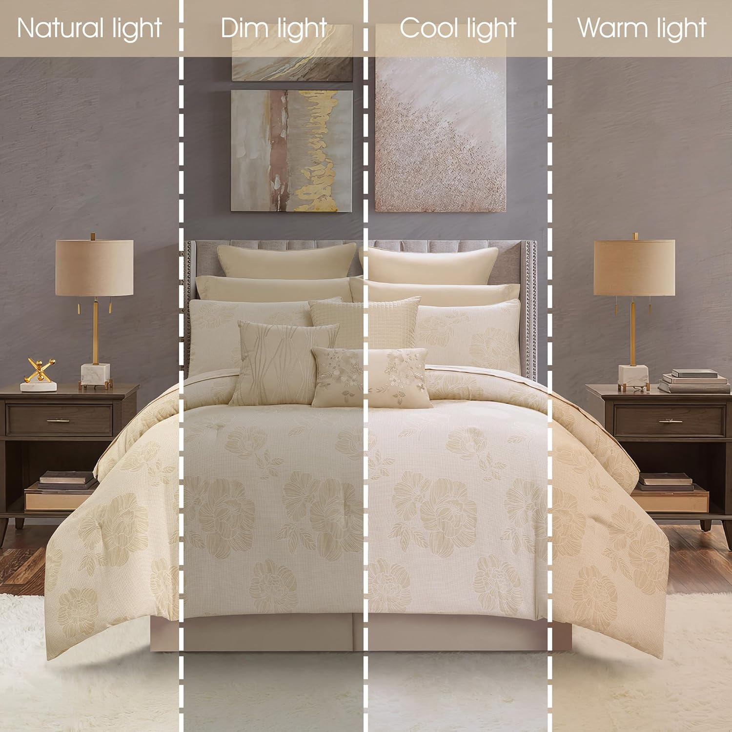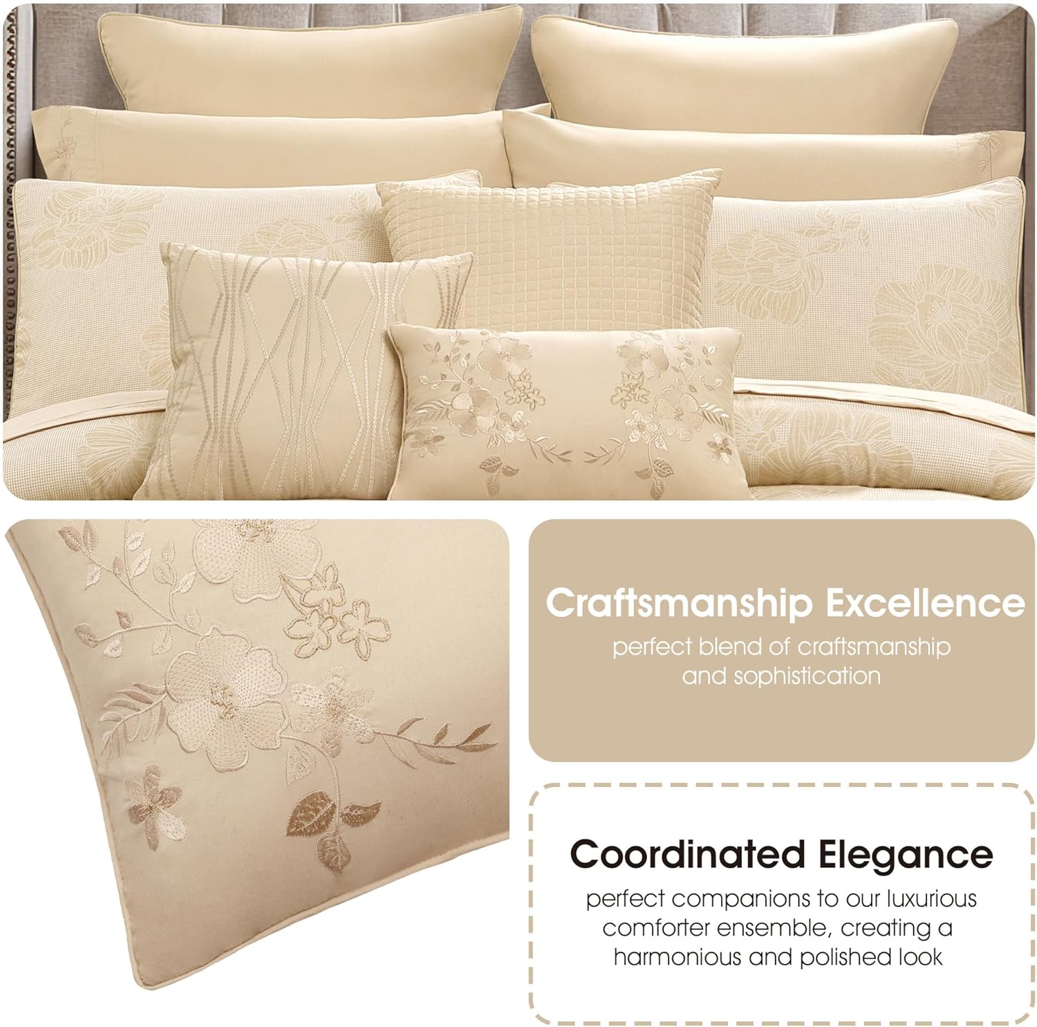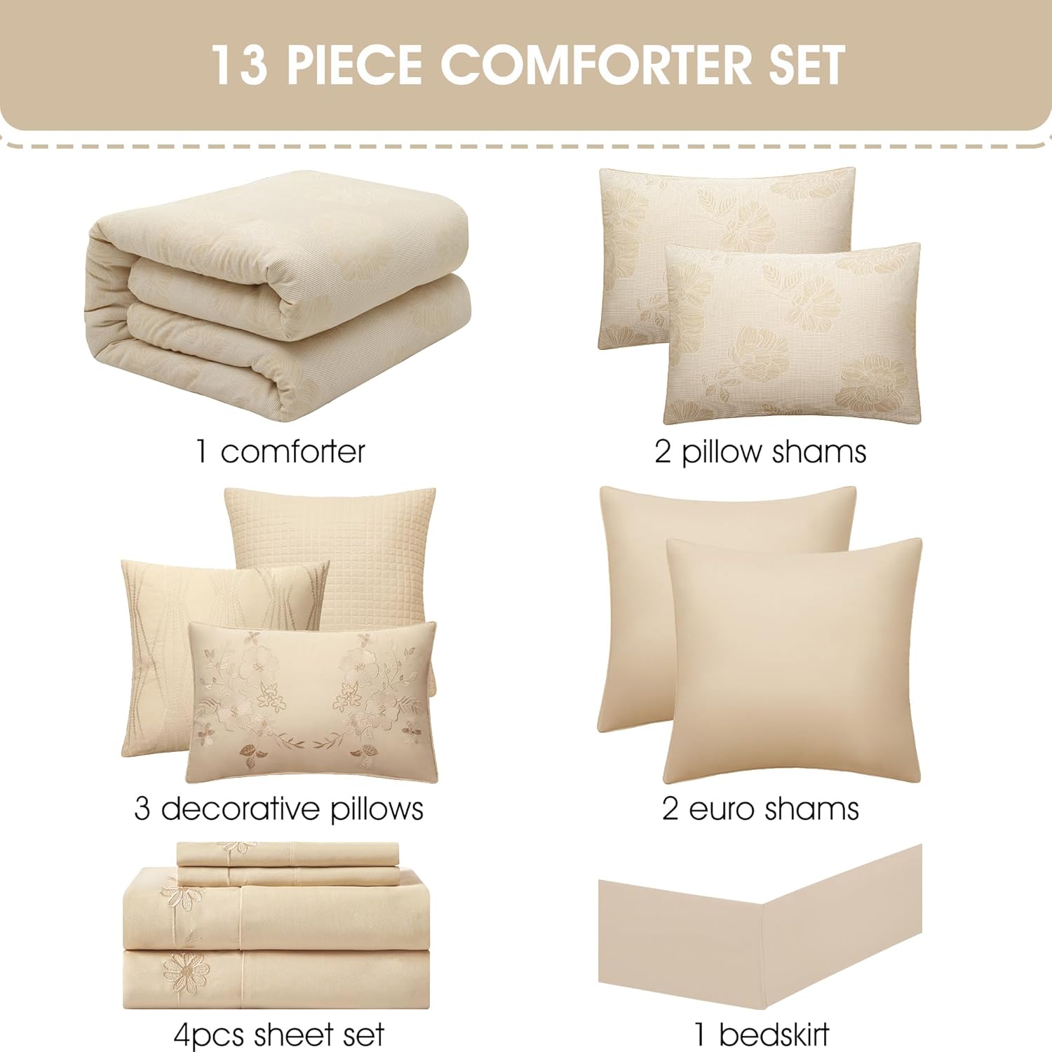 Elevate your bedroom decor with this stunning 13-piece comforter set, crafted to blend style and comfort seamlessly. The exquisite jacquard floral pattern adds a touch of elegance, making it a perfect addition to any space. Designed in a luxurious gold hue, this set is ideal for creating a warm and inviting atmosphere throughout the year.