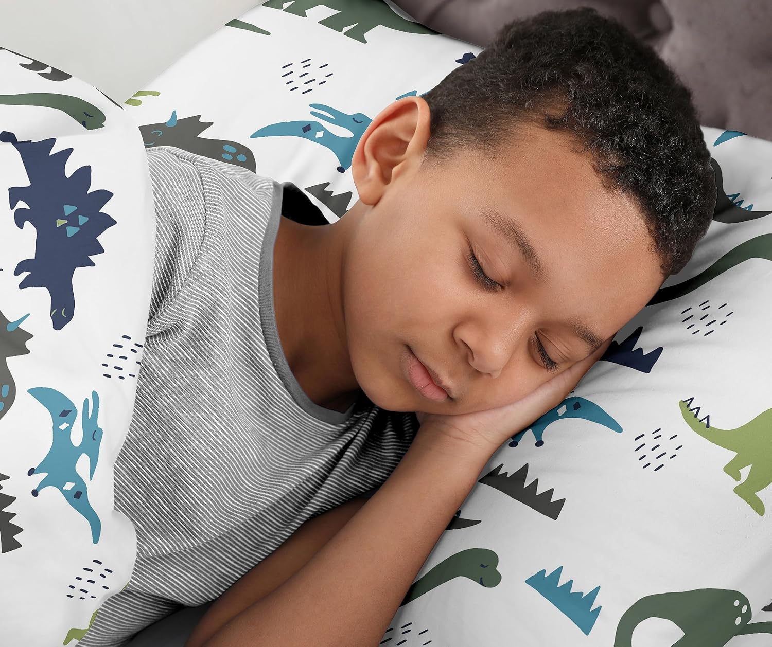 Transform your son's room into a world of imagination and comfort with this 4-piece queen sheet set. The playful dinosaur prints add a fun and adventurous vibe, perfect for any boy's bedroom. Designed with a modern color palette of green, gray, turquoise, navy blue, and crisp white, these sheets blend style with a bold theme.