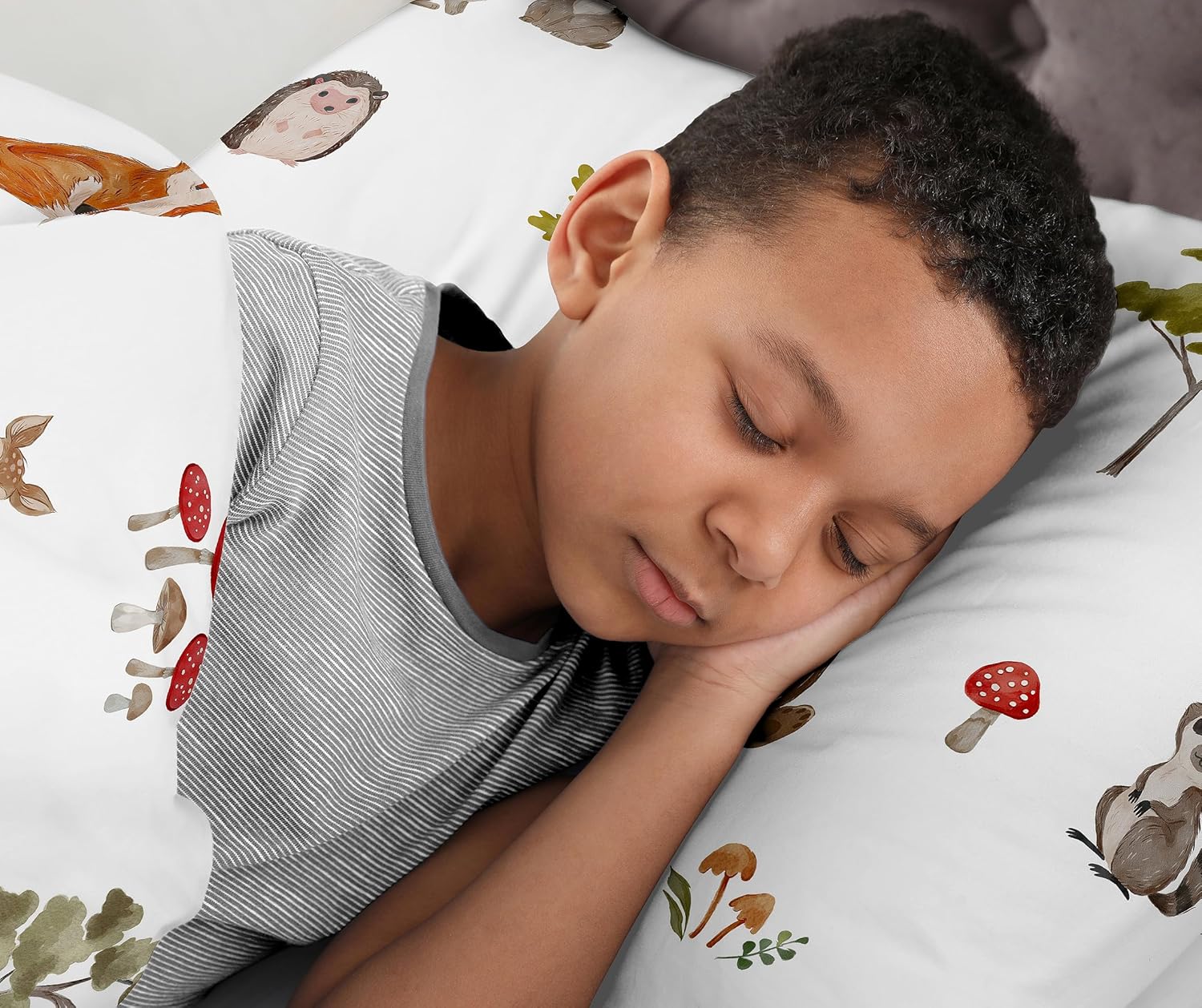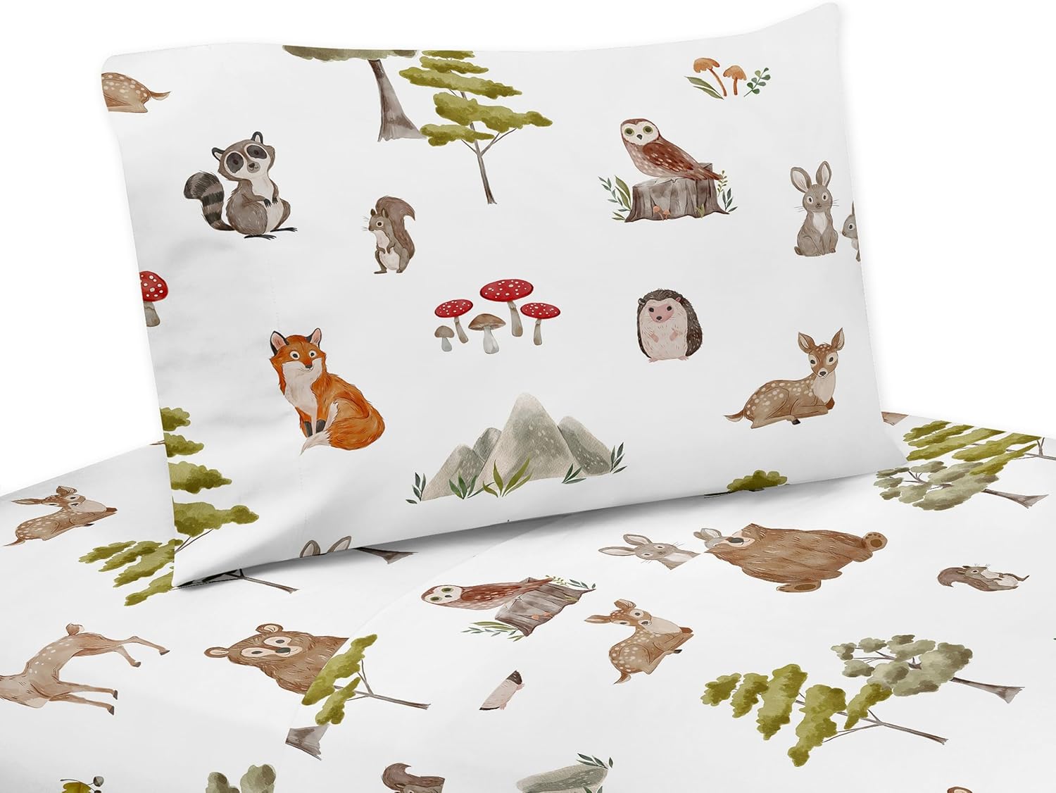 Add a delightful touch of nature to your bedroom with this charming Sweet Jojo Designs woodland animal print bedding set. The whimsical watercolor design includes adorable forest animals such as bear, fox, hedgehog, deer, and squirrel in a soft sage green, grey, and brown palette. This gender-neutral set is perfect for any room, especially a childâs bedroom or a cozy family space.