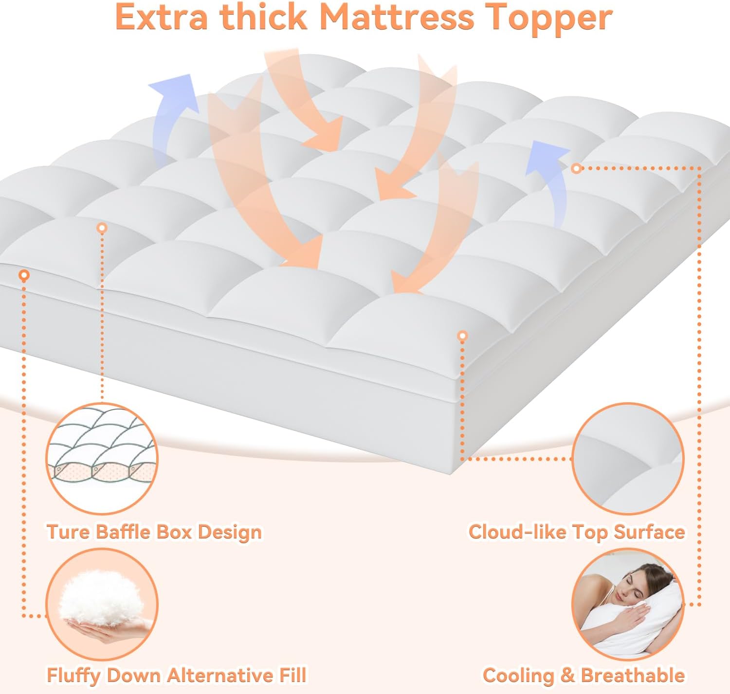 Enhance your sleep comfort with this top-quality Twin XL mattress topper. Crafted with a smart baffle box design, it ensures even weight distribution, providing a balanced feel no matter how you sleep. The soft 3D snow down alternative filling is both hypoallergenic and pressure-relieving, making it a great choice for those with sensitive skin or allergies.