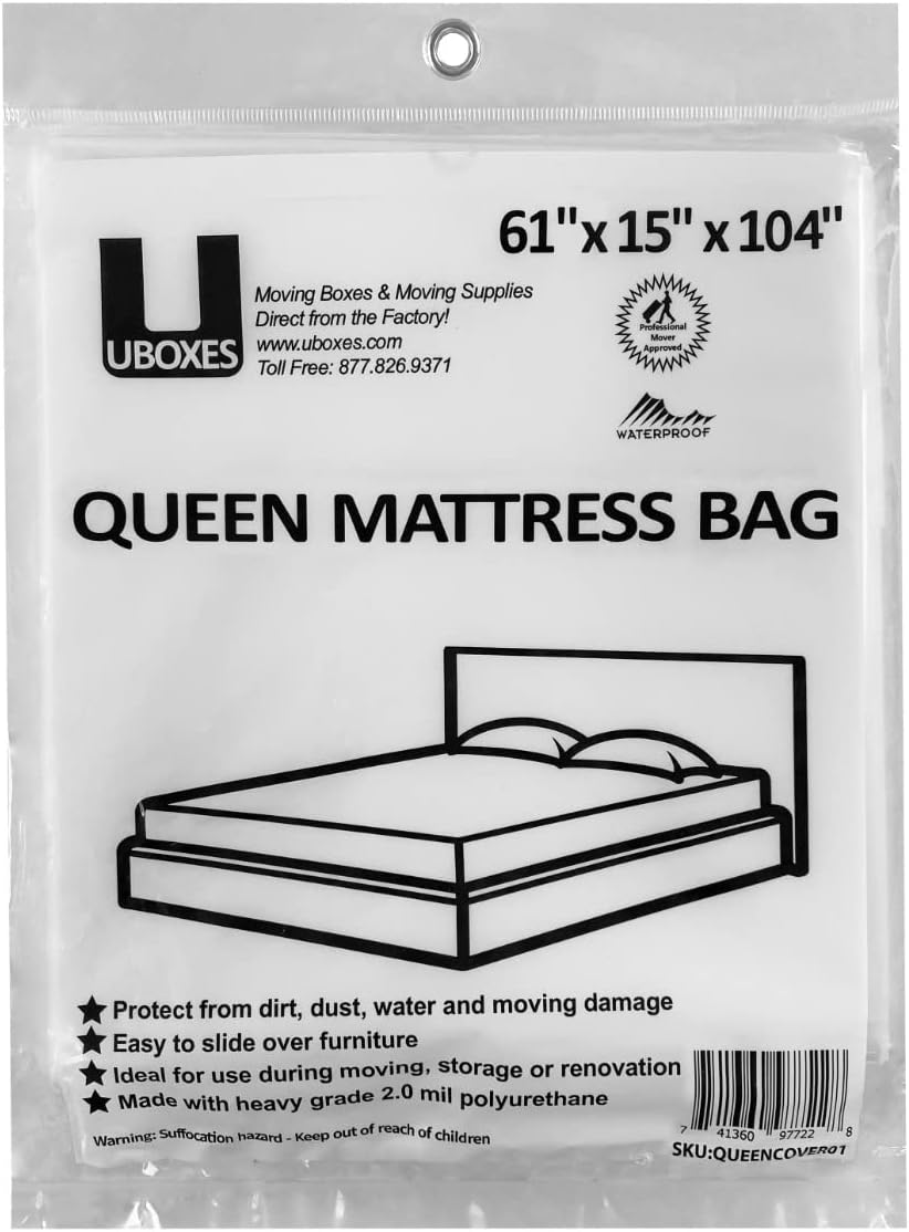 Uboxes provides a clear plastic cover for queen size mattresses, made from 2 mil heavy-duty polyethylene. It offers tear and water resistance, slips on easily, and seals with tape. Ideal for protecting mattresses during transit or storage.