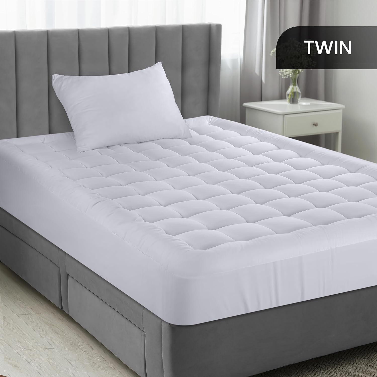 Transform your sleep with a premium twin mattress pad that combines softness, support, and style. The fluffy pillow topper creates a dreamy, cloud-like experience, while the quilted design ensures a luxurious feel under every sheet. This mattress pad is built to last, featuring box stitching that keeps the filling secure and the soft layers intact. Designed for versatility, the deep pocket cover stretches up to 16 inches, making it ideal for a wide range of beds. Whether you're looking for a simple upgrade or a budget-friendly solution, this product enhances your mattress without the need for a complete replacement. Its easy-care features, like machine washing and no-heat drying, mean you can enjoy a fresh, cozy sleep every night with minimal effort. Sleep better, feel betterâthis mattress pad is your perfect companion for a restful night's sleep. Available in multiple sizes, it's the ideal choice for anyone who values comfort and quality in their home.Utopia Bedding Twin Mattress Pad with Pillow Topper