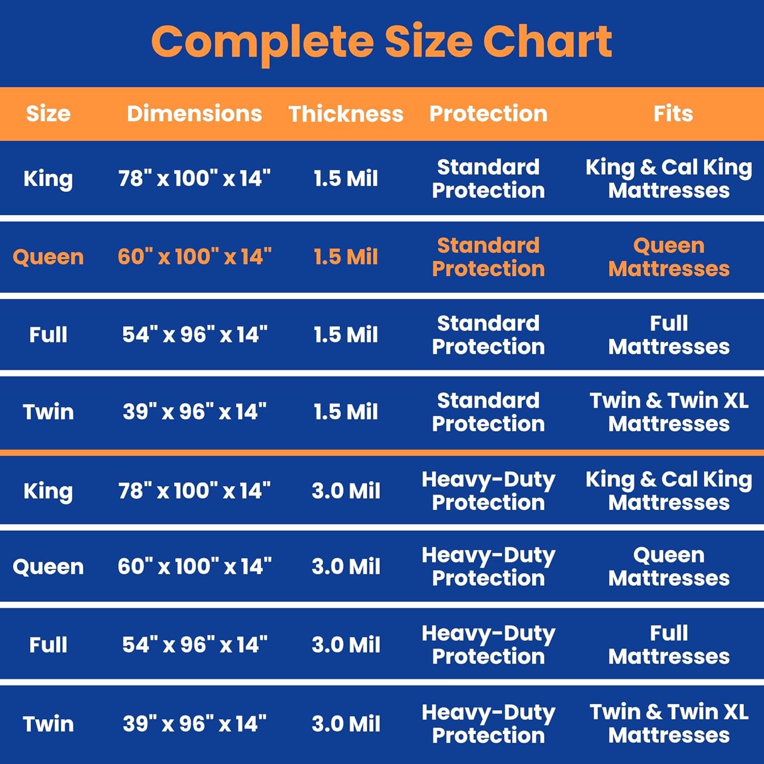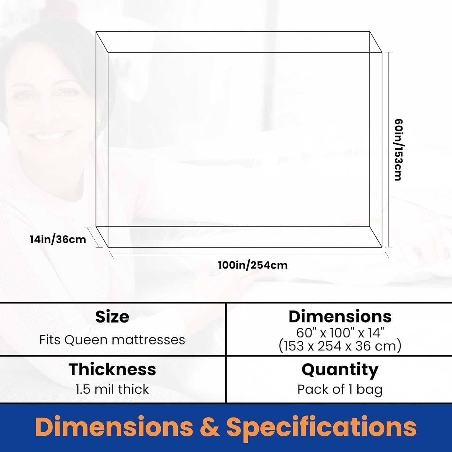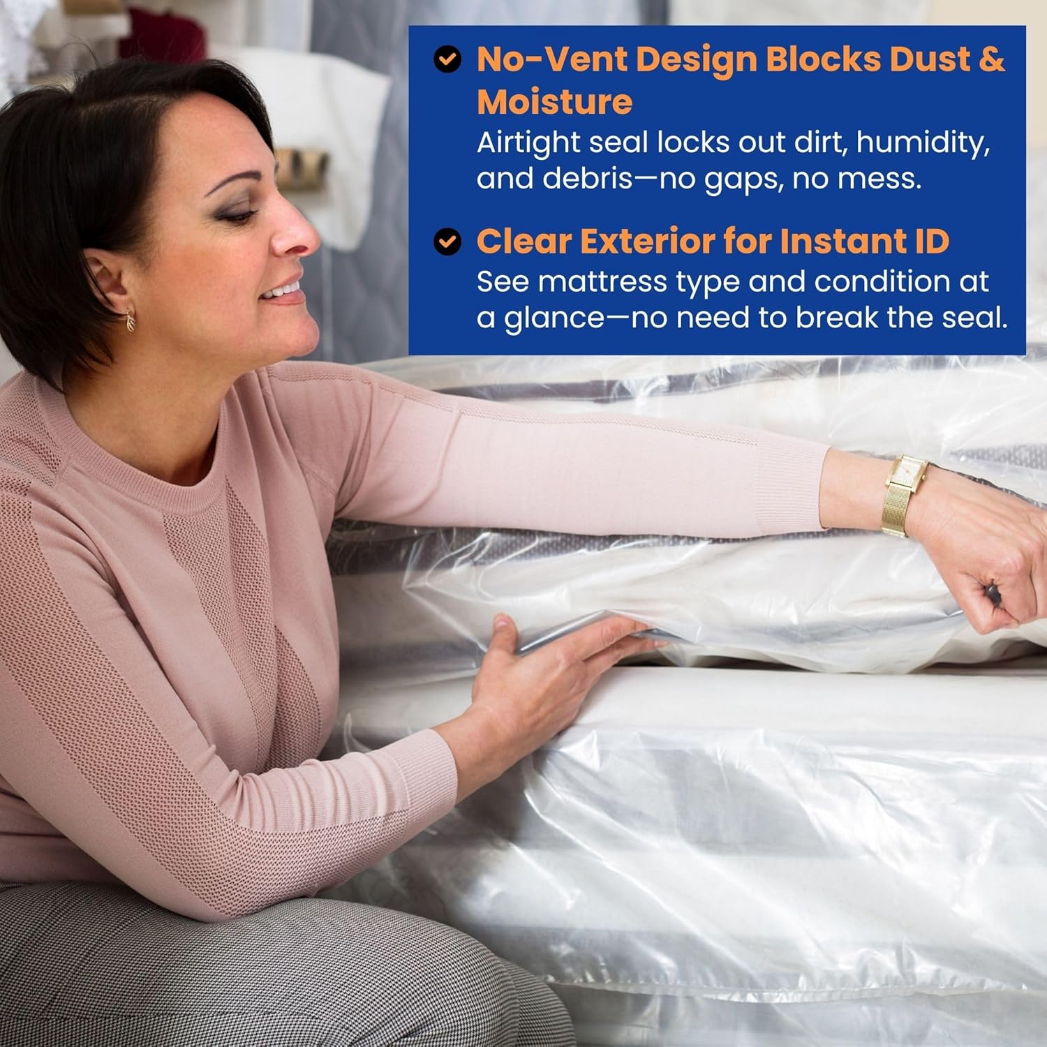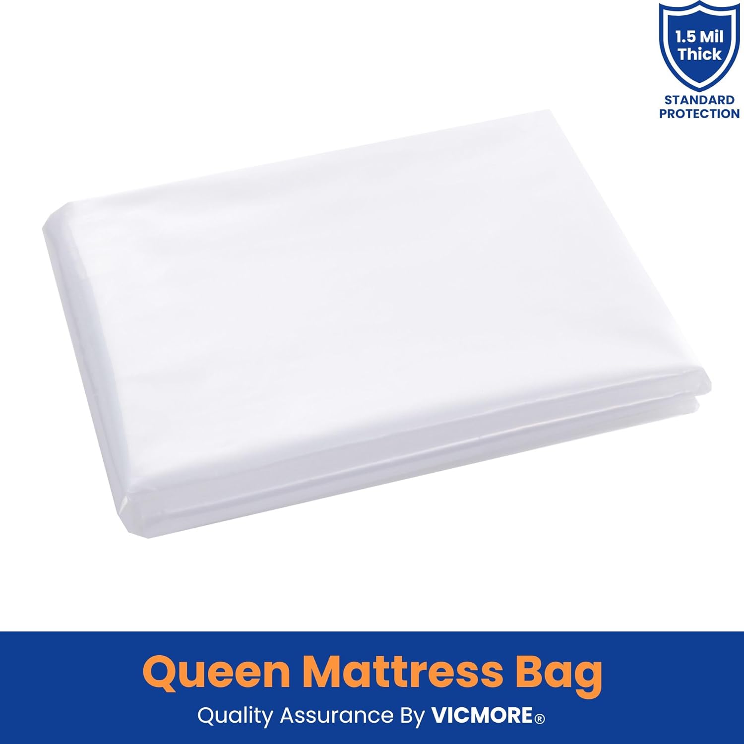 Whether you're moving, storing, or getting rid of your mattress, the VICMORE Queen Mattress Bag ensures it stays in excellent condition. Built with 1.5 mil thick, odorless, and eco-friendly plastic, it provides durable, long-lasting protection against dust, moisture, and stains. The upgraded envelope-style closure fits snugly around all queen-sized mattressesâstandard, pillow-top, or memory foamâwithout any gaps. This full-coverage design prevents shifting and damage, making it perfect for transporting or keeping your mattress safe for extended periods.