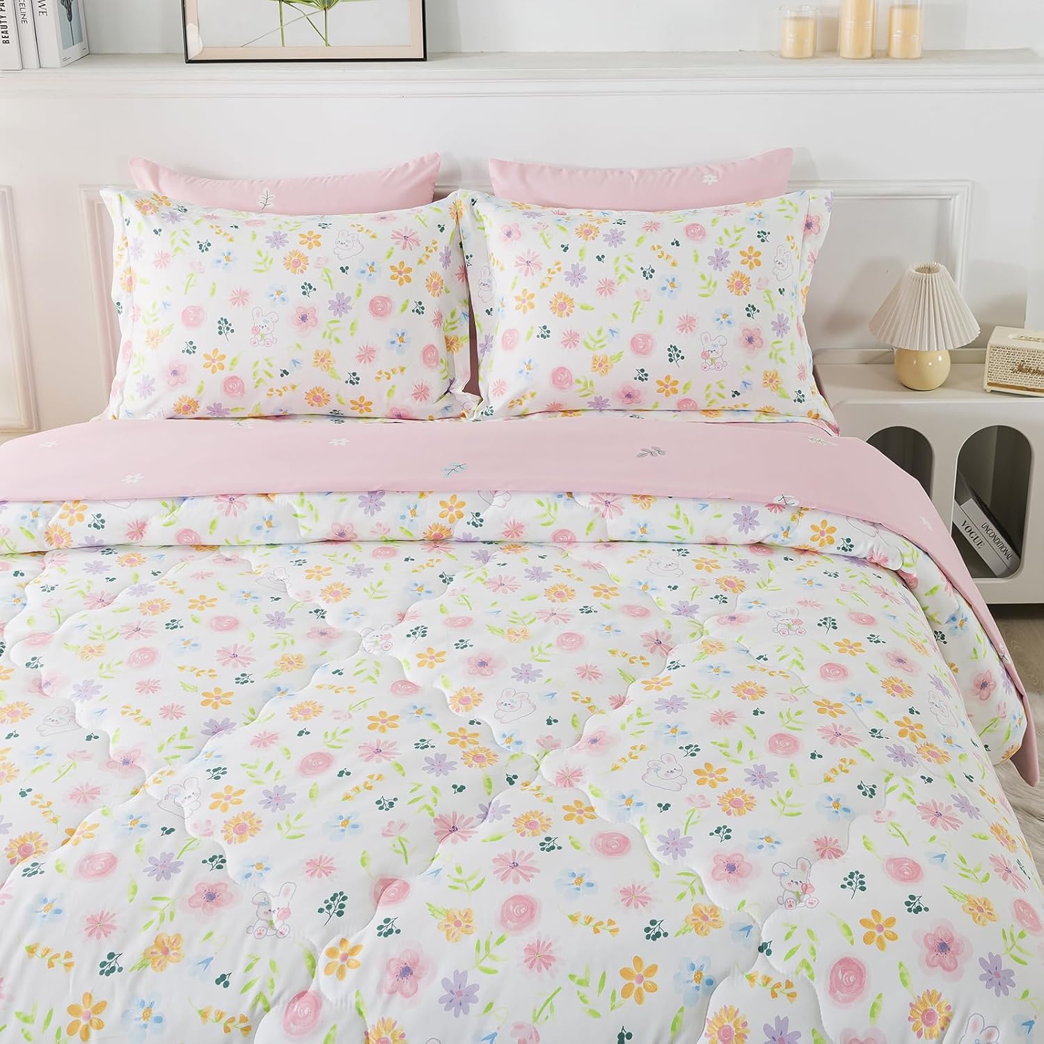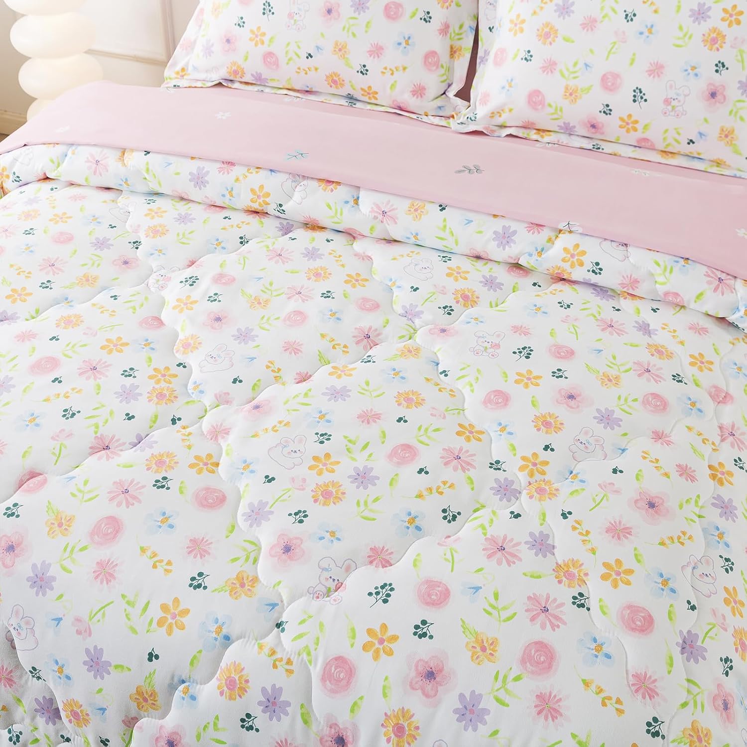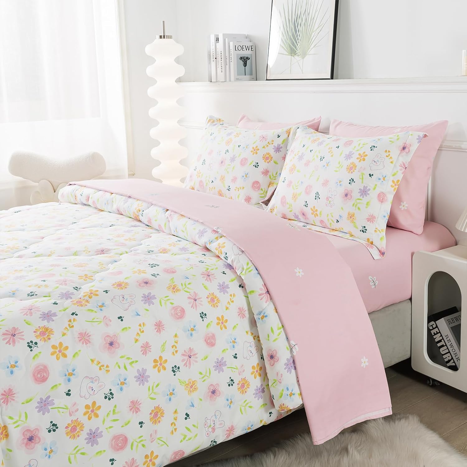 A 7-piece floral comforter bed-in-a-bag set featuring a 80x90 comforter, 2 standard pillowcases, 2 pillow shams, 1 fitted sheet, and 1 flat sheet. Perfect for kids' rooms, with a soft microfiber design and easy care instructions.
