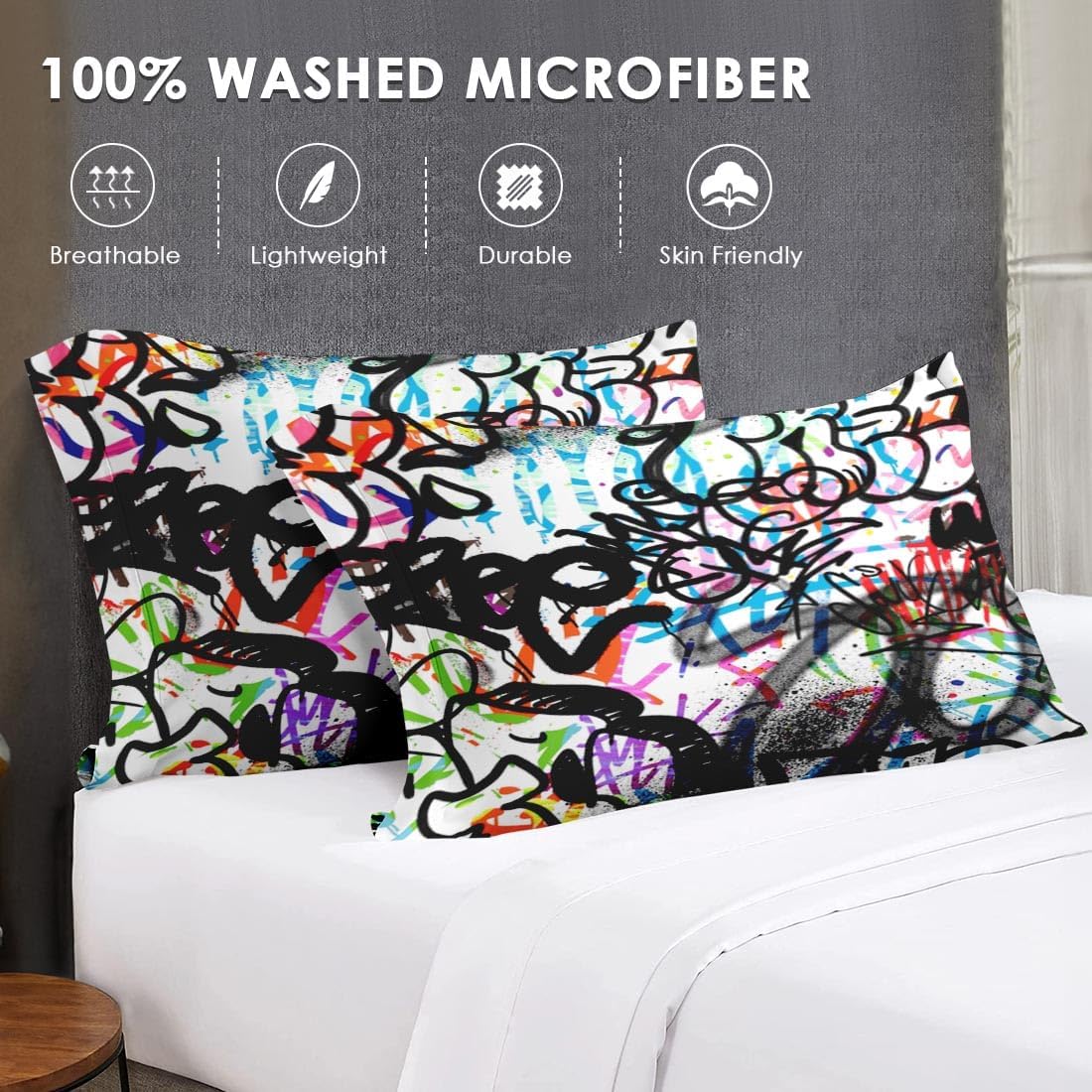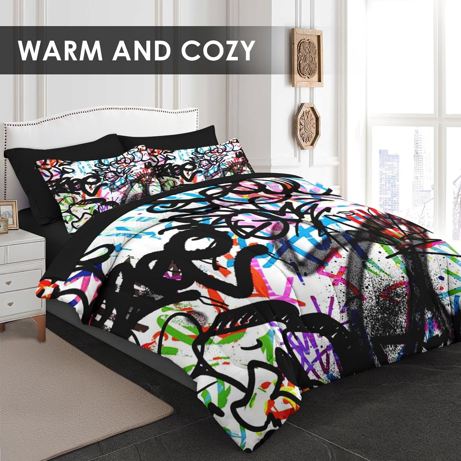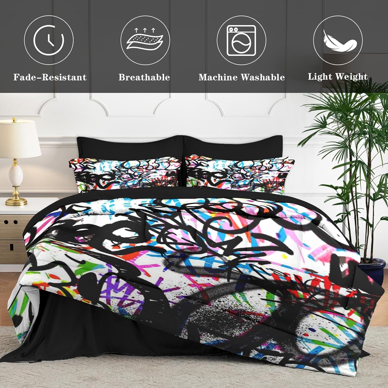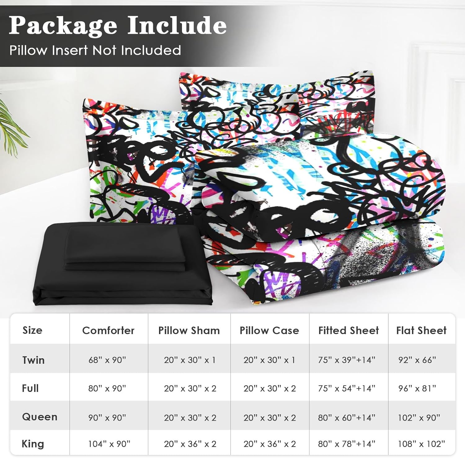 Featuring a modern urban skateboard and music abstract graffiti design, this comforter set adds a vibrant, artistic touch to your bedroom. The collection includes 1 comforter, 2 pillowcases, 2 shams, 1 fitted sheet, and 1 flat sheetâall sized to fit standard queen beds. Deep pockets and elastic edges ensure a secure, snug fit without shifting, making it ideal for frequent use and long-term comfort.
