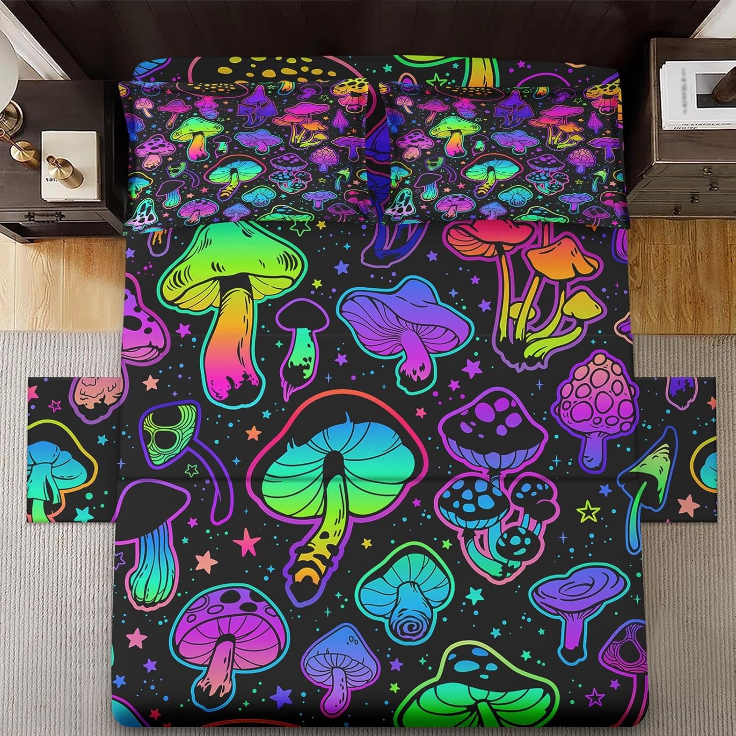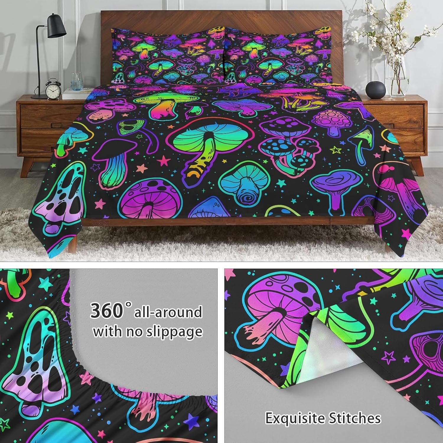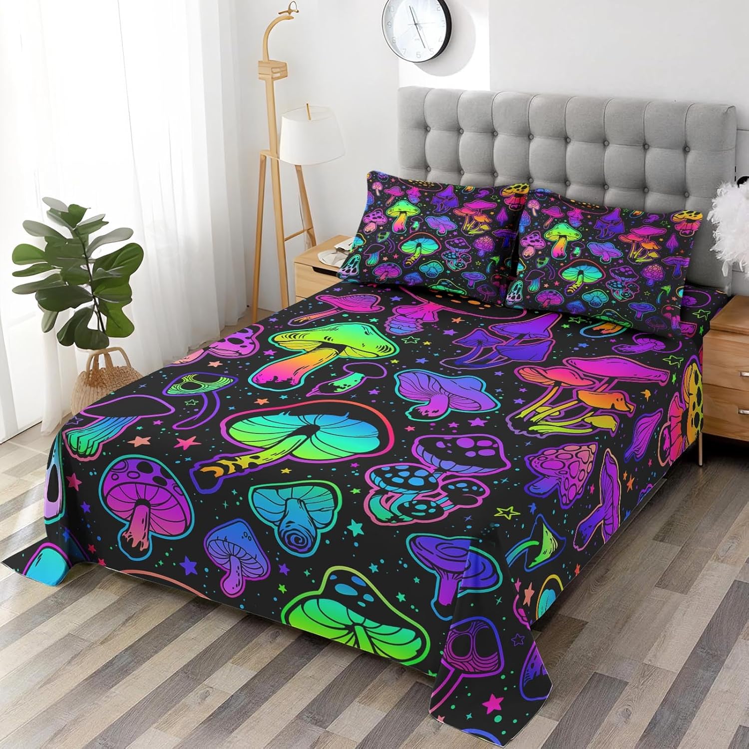 This bedding set features a bold and eye-catching neon mushroom design that brings a contemporary touch to your space. Whether you're setting up a cozy room for your little one or looking for a stylish upgrade for your guest bedroom, this set is the perfect blend of function and fashion. It includes a flat sheet, fitted sheet, and two coordinately patterned pillowcasesâideal for creating a complete, elegant look that suits both kids and adults.