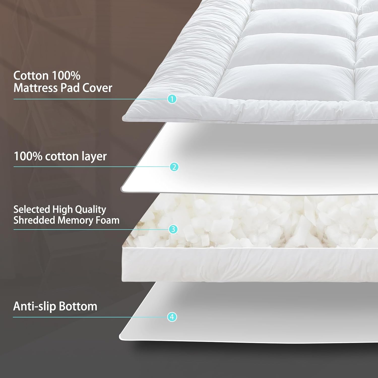 Designed to transform your mattress into a cloud-like surface, this 4-inch queen size memory foam mattress topper offers a perfect blend of comfort and support. Featuring a soft 100% cotton cover, it ensures a skin-friendly experience, while the fluffy shredded memory foam conforms to your body, providing personalized relief for pressure points and promoting better posture.
